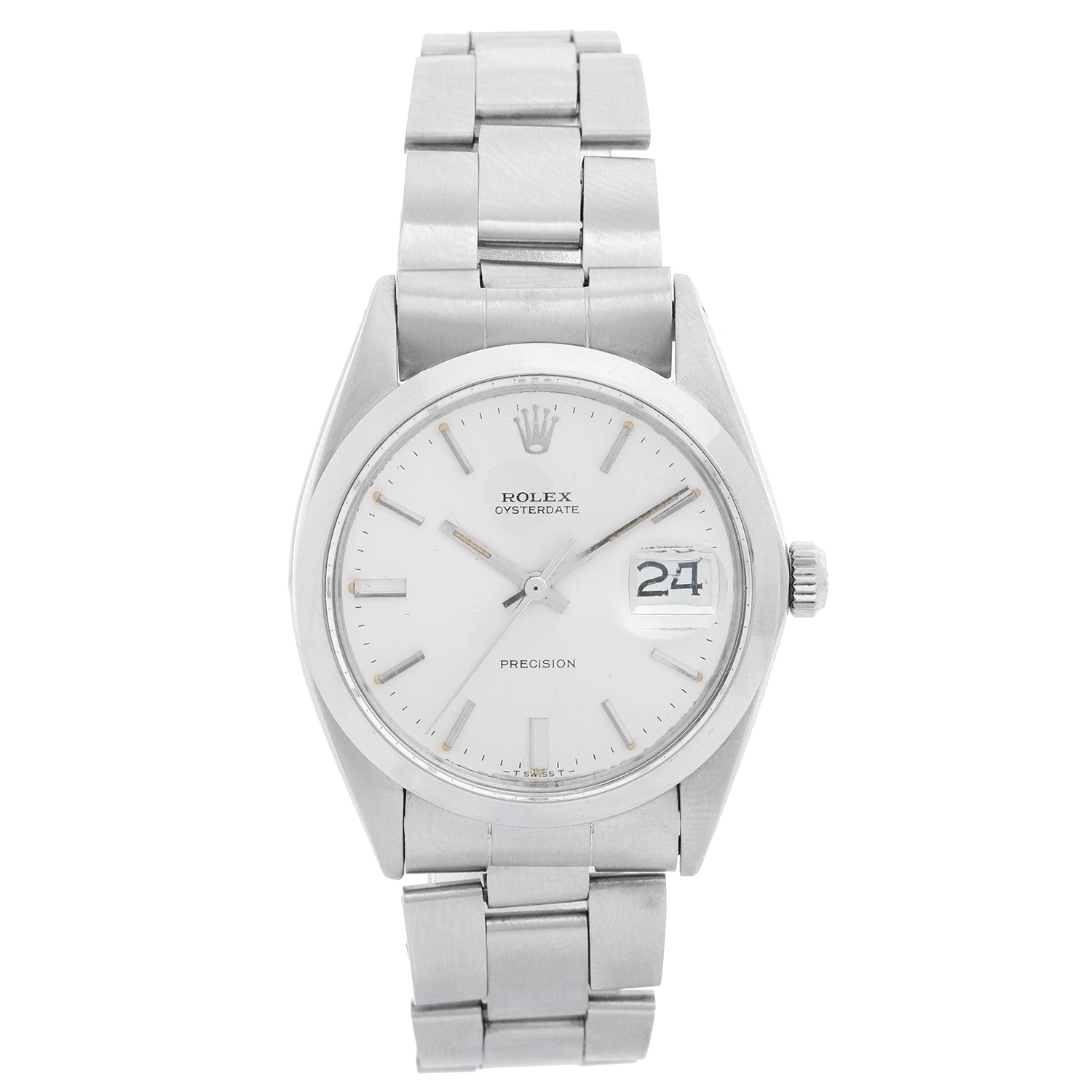 Men's Rolex Oysterdate Silver Dial Watch 6694 - Automatic winding. Stainless steel (34 mm ) . Silver dial with stick hourmarkers. Oyster bracelet. Pre-owned with custom box .