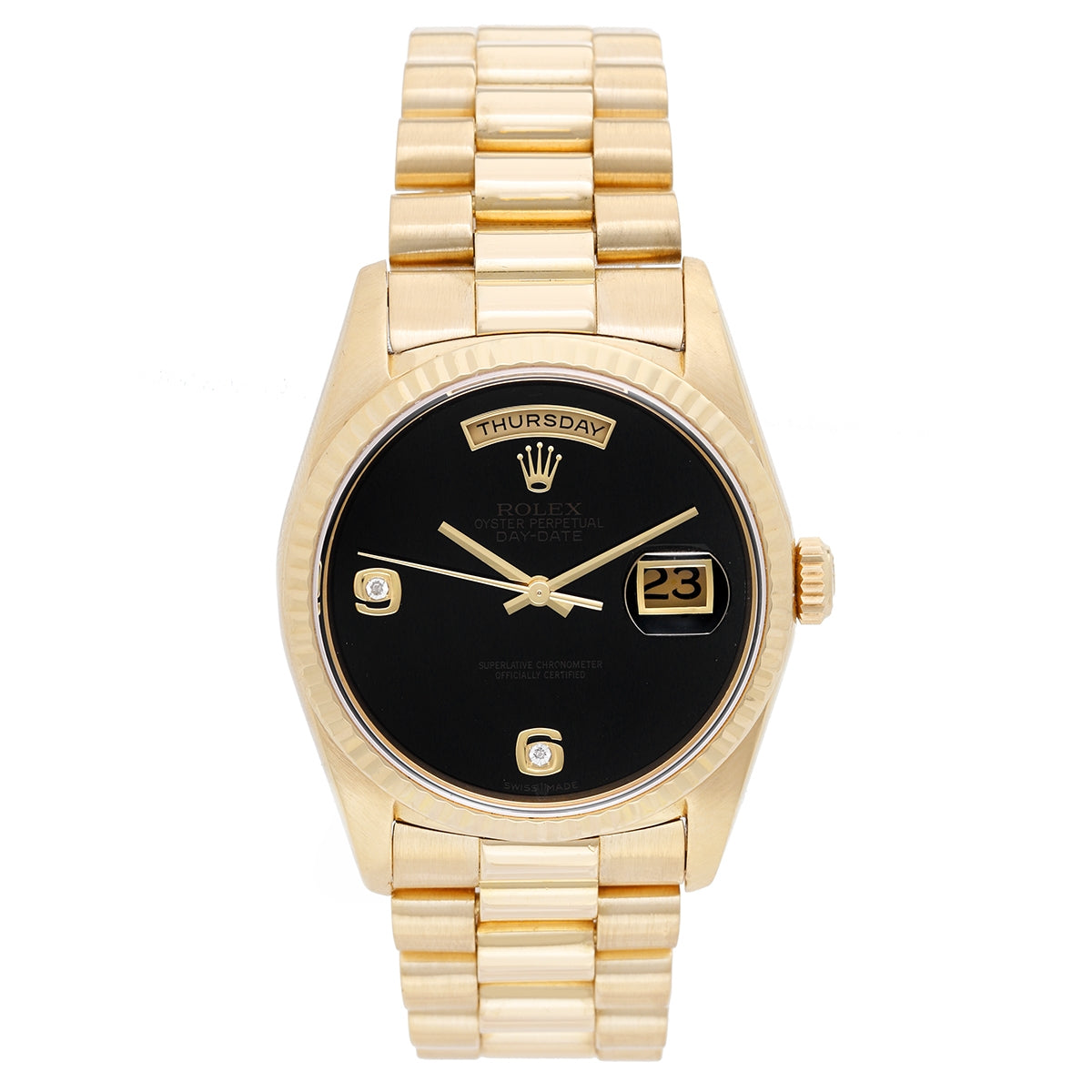 Men's Rolex President - Day-Date Watch 18238 Onyx Dial - Automatic winding, 31 jewels, Quickset day/date, sapphire crystal. 18k yellow gold case with fluted bezel ( 36 mm ) (36mm diameter). Very rare Factory Onyx dial with diamond Arabic hour markers at 6 o'clock and 9 o'clock. 18k yellow gold hidden-clasp President bracelet. Pre-owned with box.