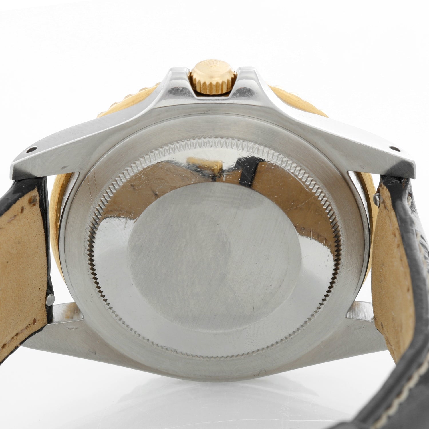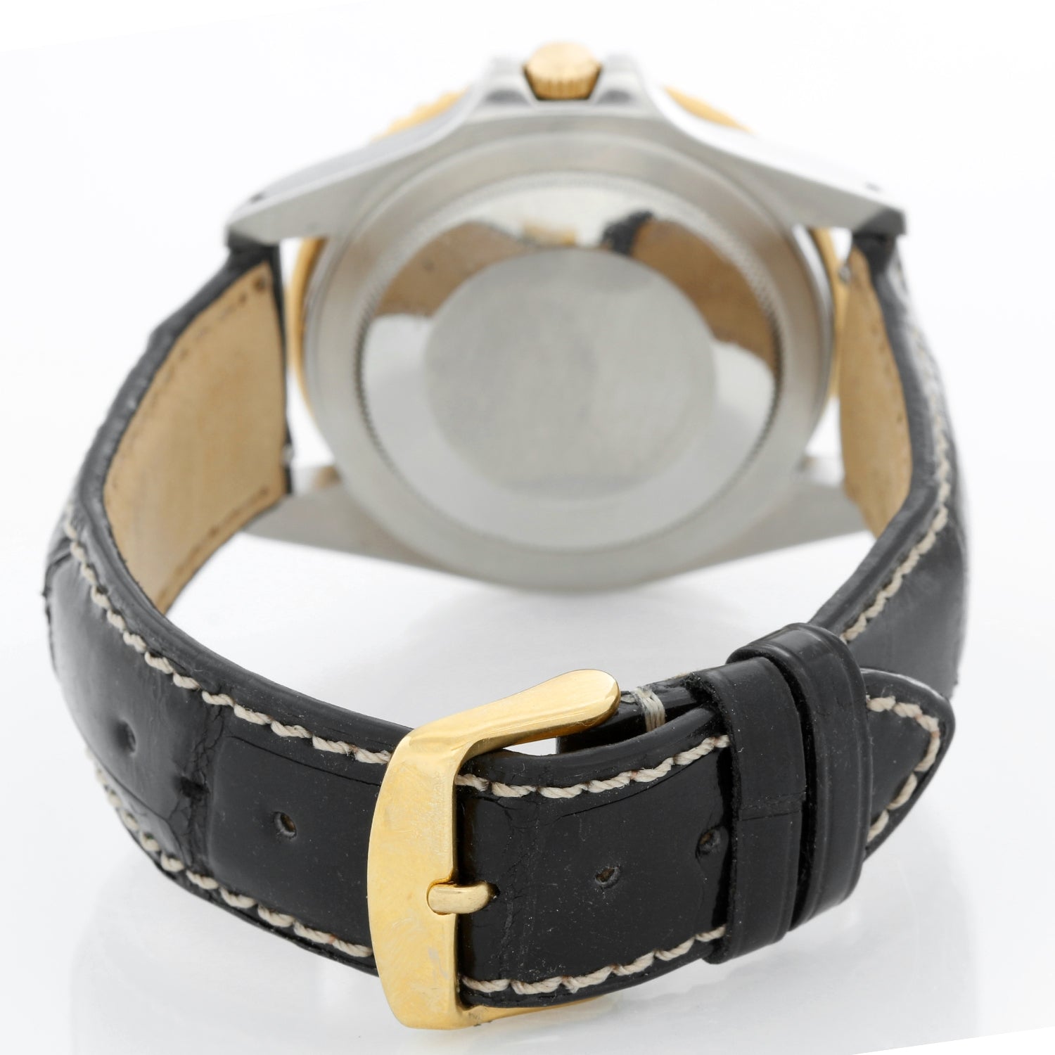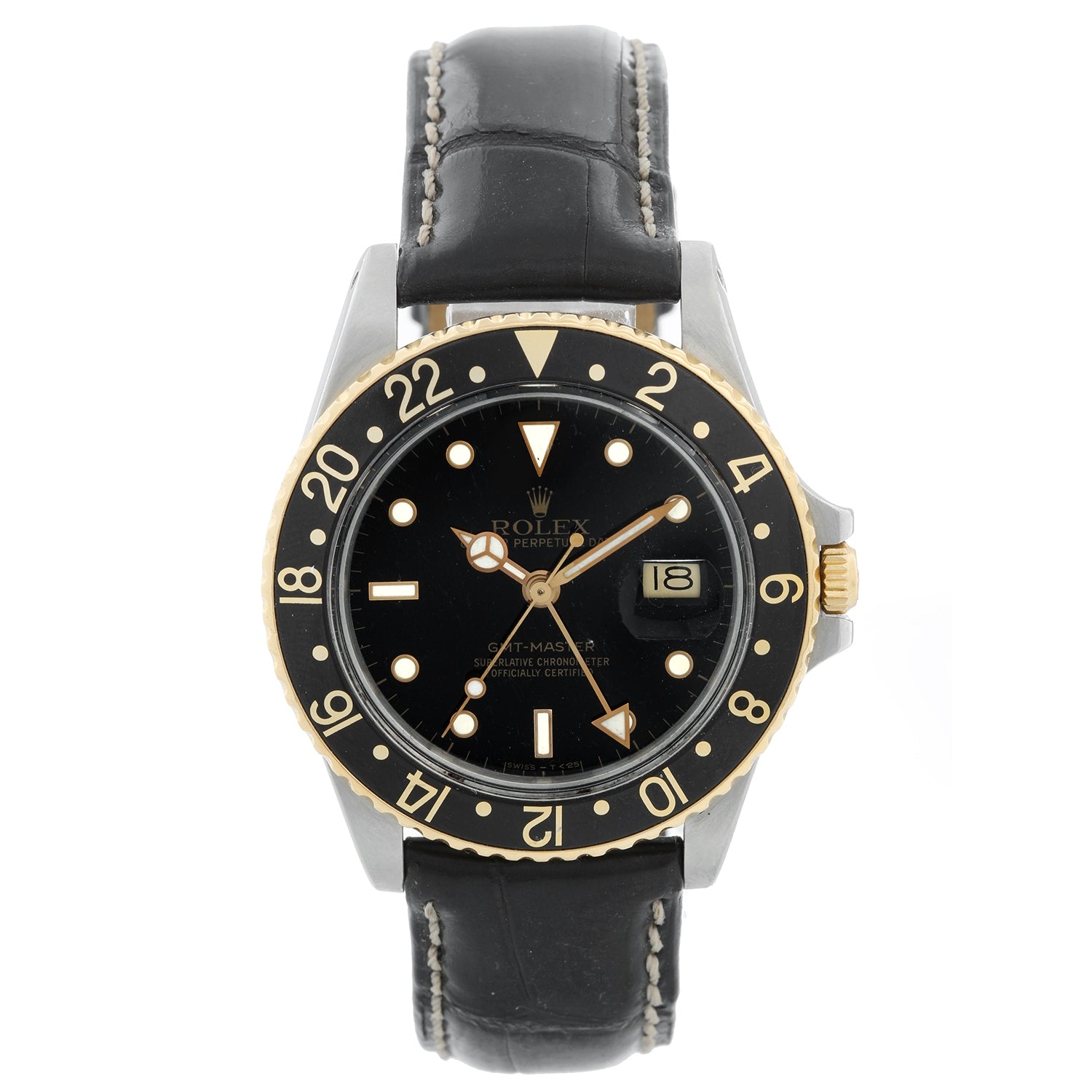 Rolex 2-Tone GMT-Master 16753 on a Strap - Automatic winding. Stainless steel with gold bezel ( 40 mm ). Black dial with gold framed hour markers with date. Black alligator strap with tang buckle. Pre-owned with Rolex box and books