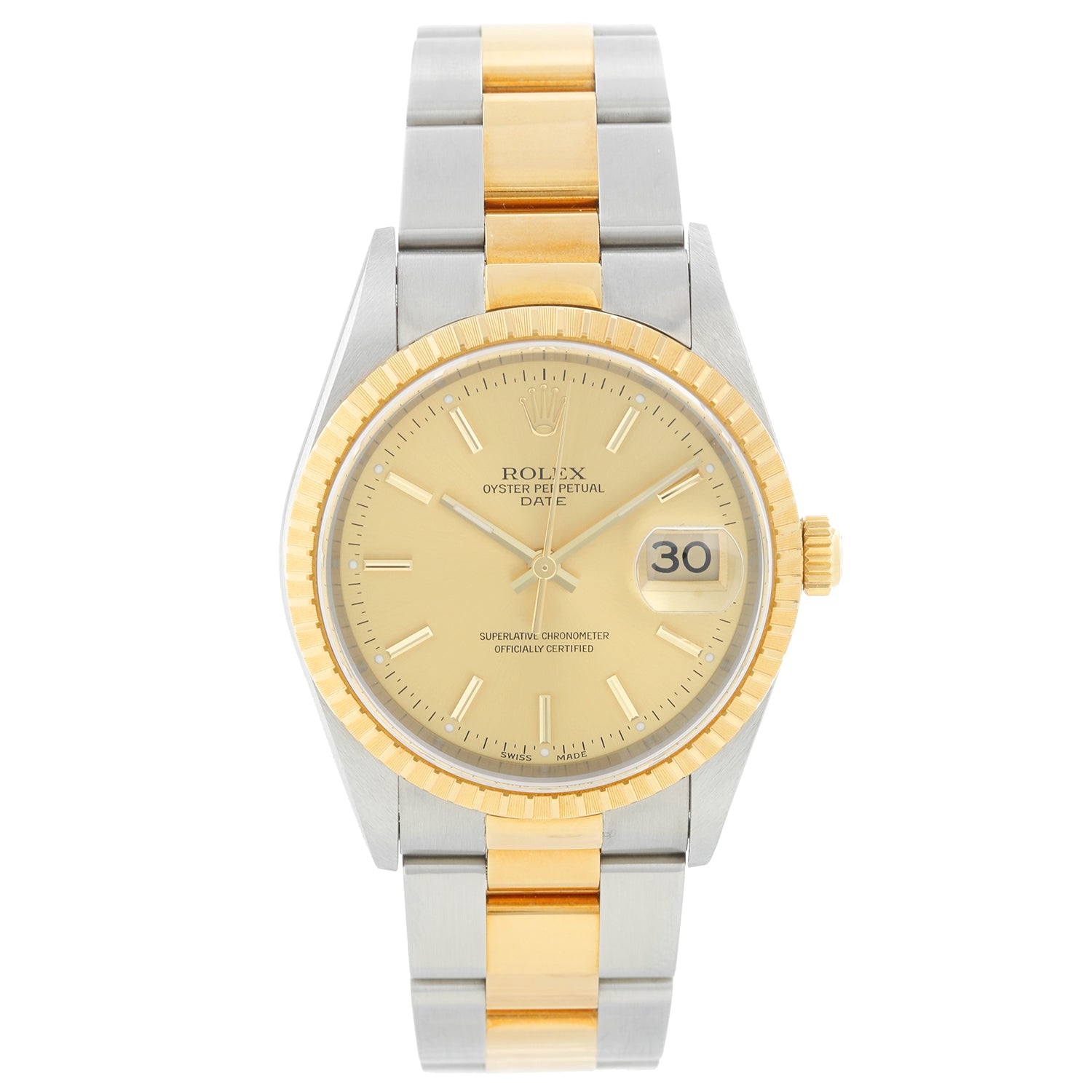 Rolex 2-Tone Steel Gold 34mm Date Men's/Ladies Watch 15223- Automatic winding, Quickset, sapphire crystal. Stainless steel case with yellow gold fluted bezel (34mm diameter). Champagne dial with stick markers. Stainless steel and 18k yellow gold Oyster bracelet. New old stock with box and papers .