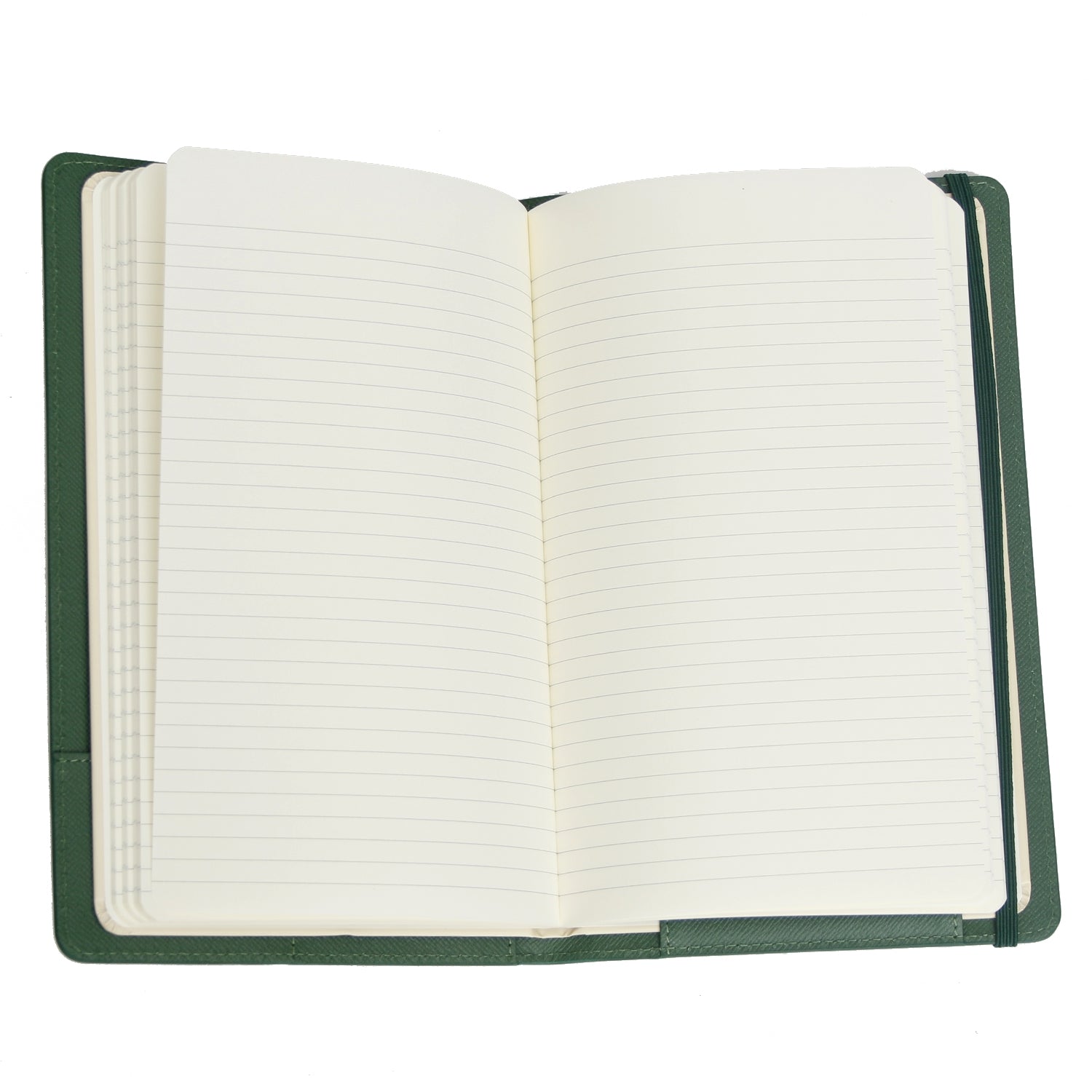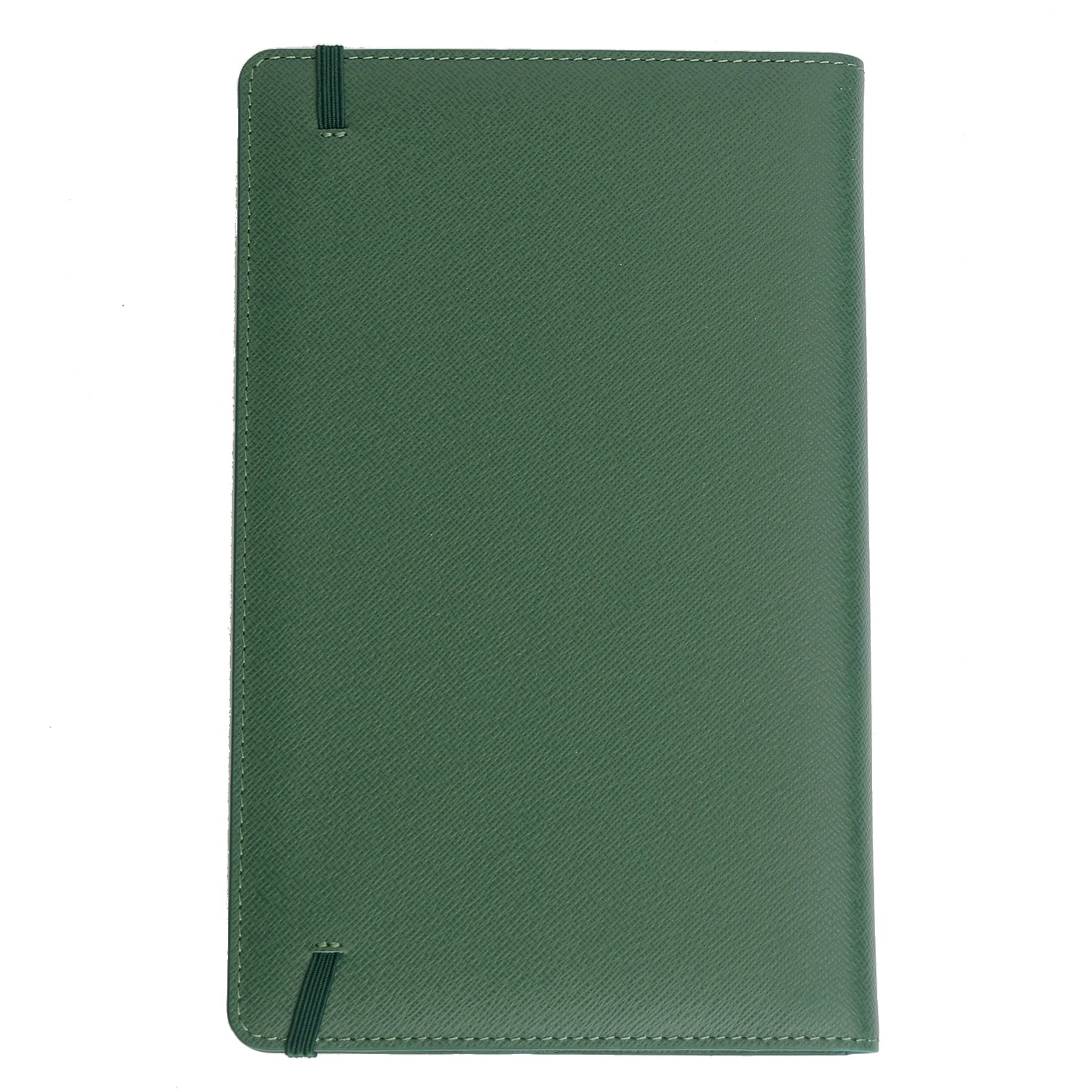 Rolex Agenda with Green Leather Cover - Green Saffiano leather Rolex agenda cover with tonal stitching throughout, 2 small slit pockets, embossed brand stamp at cover and elasticized closure at edge. Includes hardcover notebook insert.