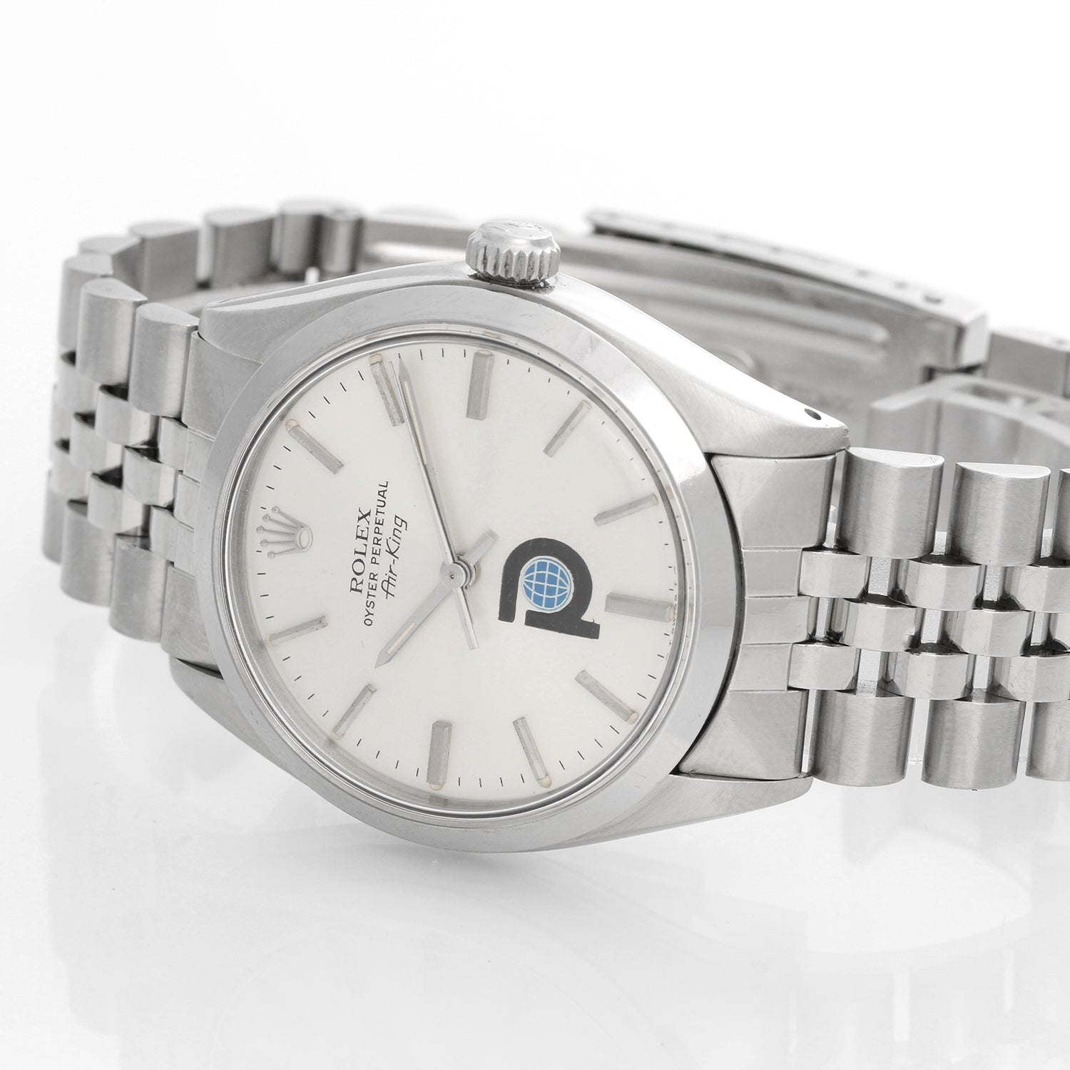 Rolex Air King Stainless Steel Men's Watch Ref 1002 - Automatic winding, acrylic crystal. Stainless steel case with smooth bezel ( 34.5 mm ) . Silver stick dial with Pool Intairdril Logo. Stainless steel Jubilee bracelet. Engraved James W. Bomar 3-31-55