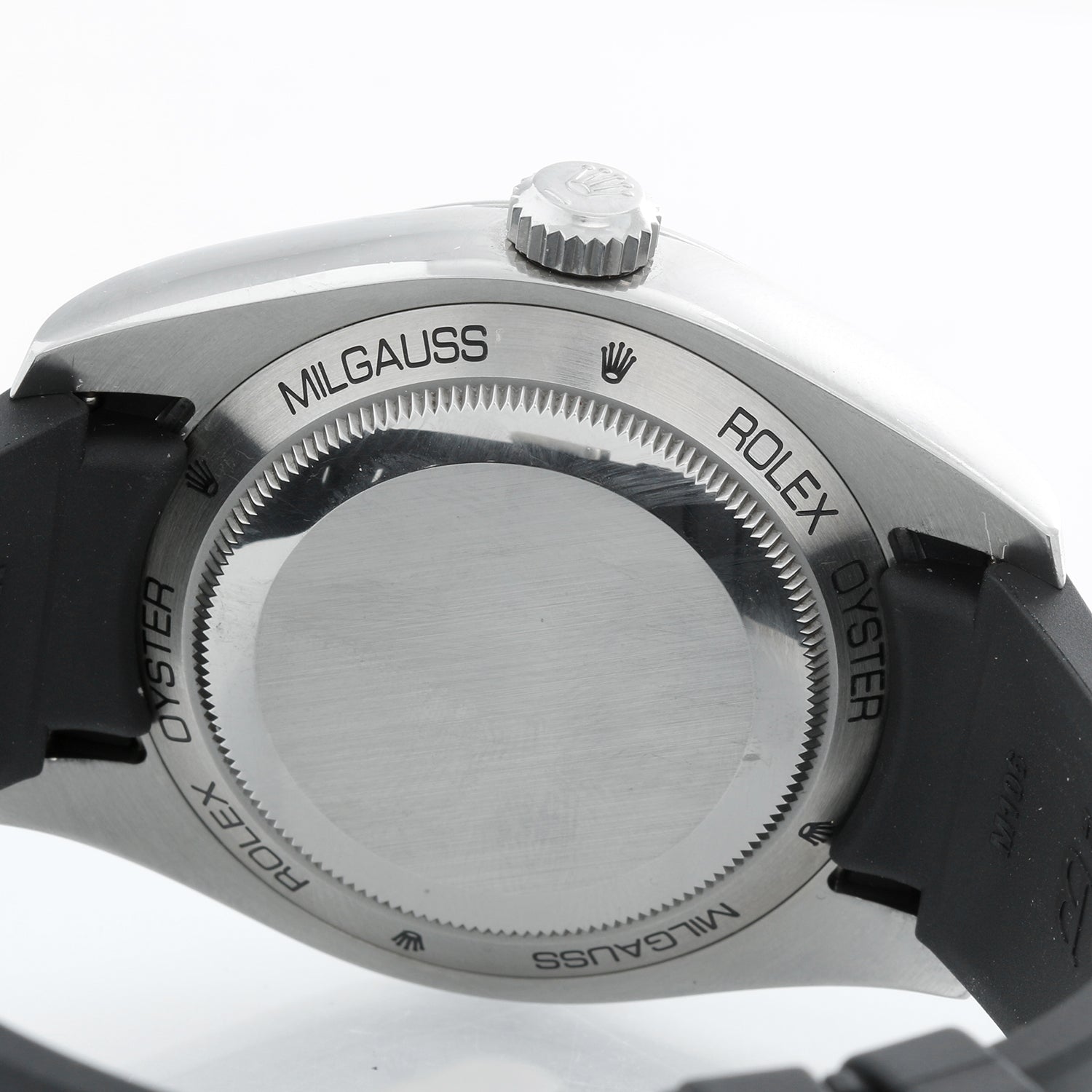 Rolex "Blue" Milgauss Stainless Steel Men's Watch 116400 GV - Automatic winding, sapphire "green" crystal, 31 jewels. Stainless steel case with smooth bezel (40mm diameter). Blue dial with luminous-style markers. Black and Green Rubber -B Strap. Pre-owned with Rolex box and books