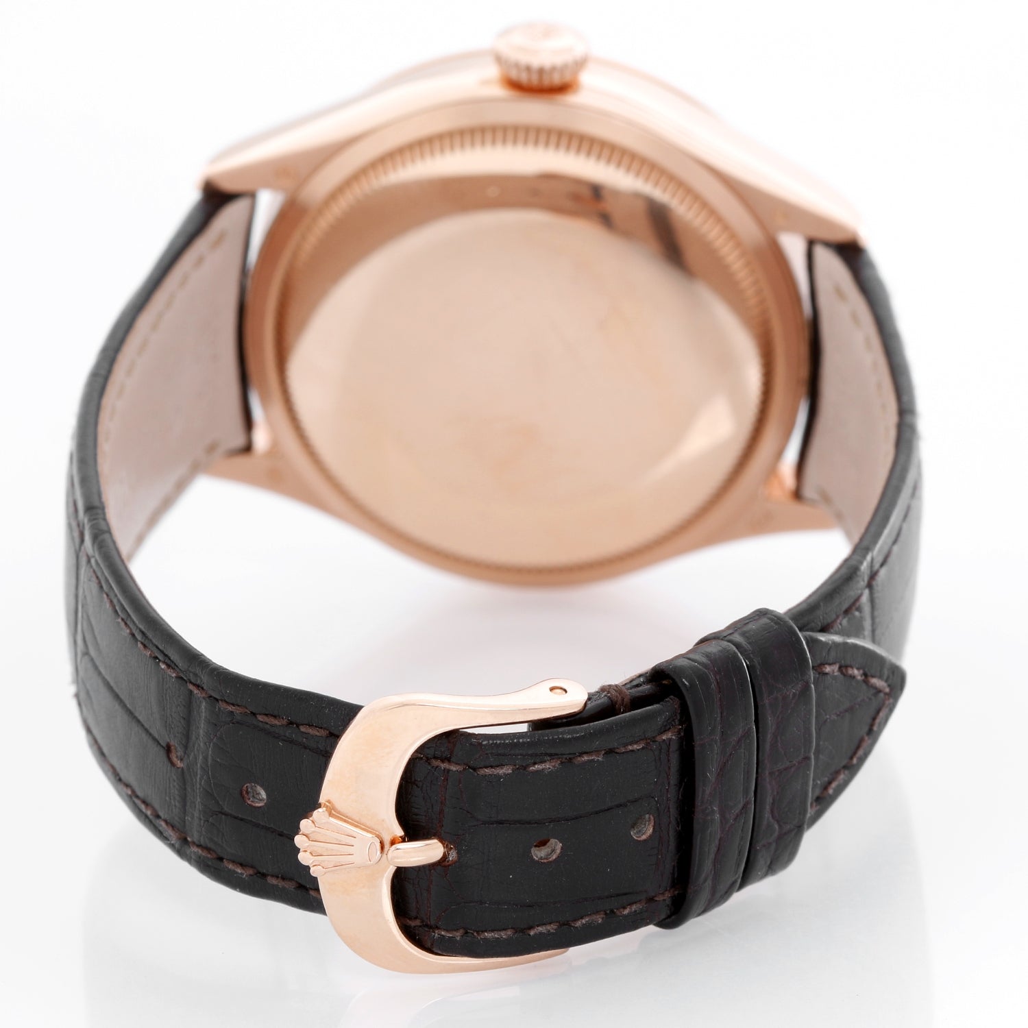 Rolex Cellini Dual Time 18K Rose Gold Men's Watch - Automatic winding . 18K Everrose; Rose Gold ( 39 mm). Chocolate dial with sub dial at 6 o'clock. Brown leather strap with Rose gold deployant clasp. Unused with Rolex box and card. Like new, looks like it has never been worn. Rolex card dated 2017