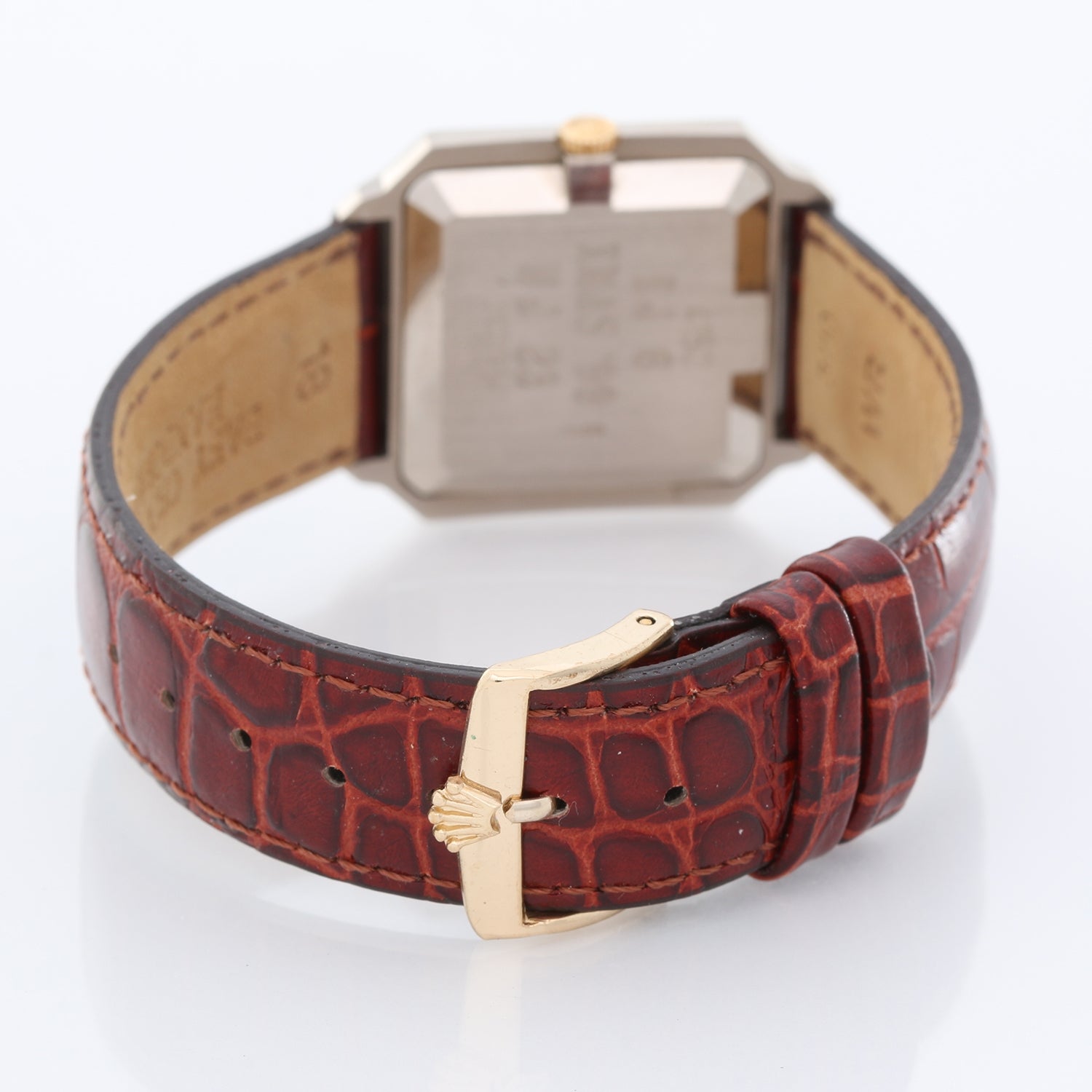 Rolex Cellini Two -Tone Men's Watch 4150 - Manual winding. 18K White Gold with 18K Yellow Gold coin bezel ( 29 mm x 33 mm ). Silver dial with gold hour markers. Brown strap with yellow gold buckle. Pre-owned with custom box. Back of case has an engraving " EJ 6, Xmas '99, MJ 23".