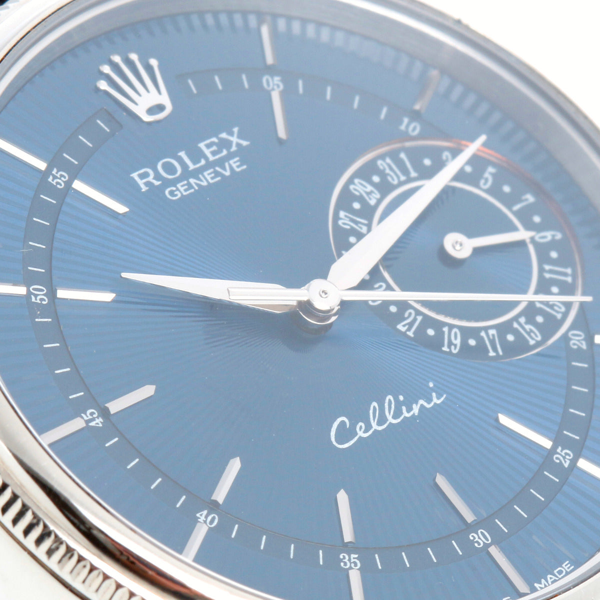 Rolex Cellini White Gold Mens Dress Watch Ref 50519 - Automatic. 18K White Gold ( 39 mm). Blue dial with stick hour markers. Black Leather Strap with Rolex buckle. Pre-owned with Rolex box .