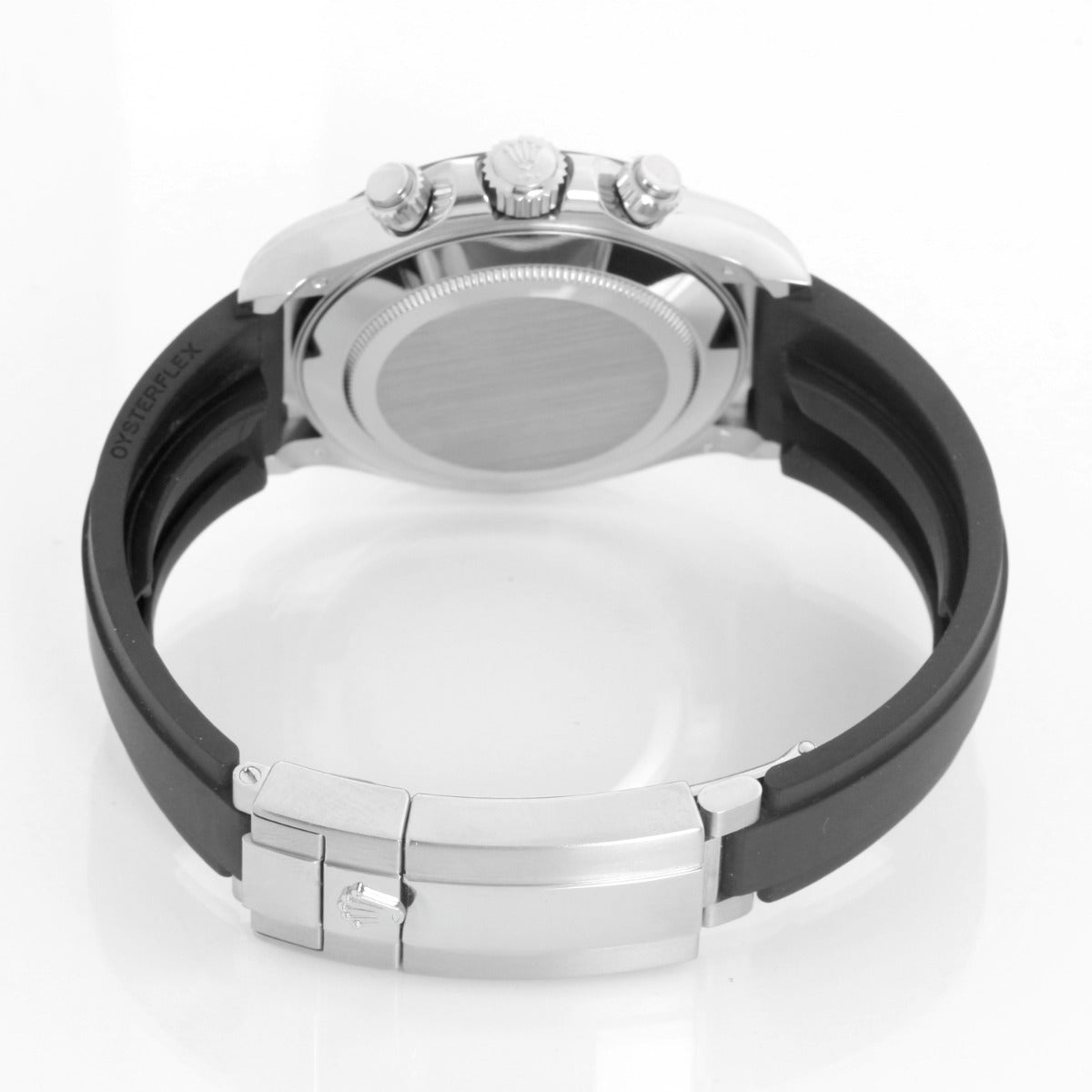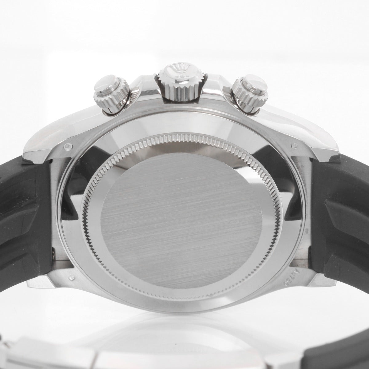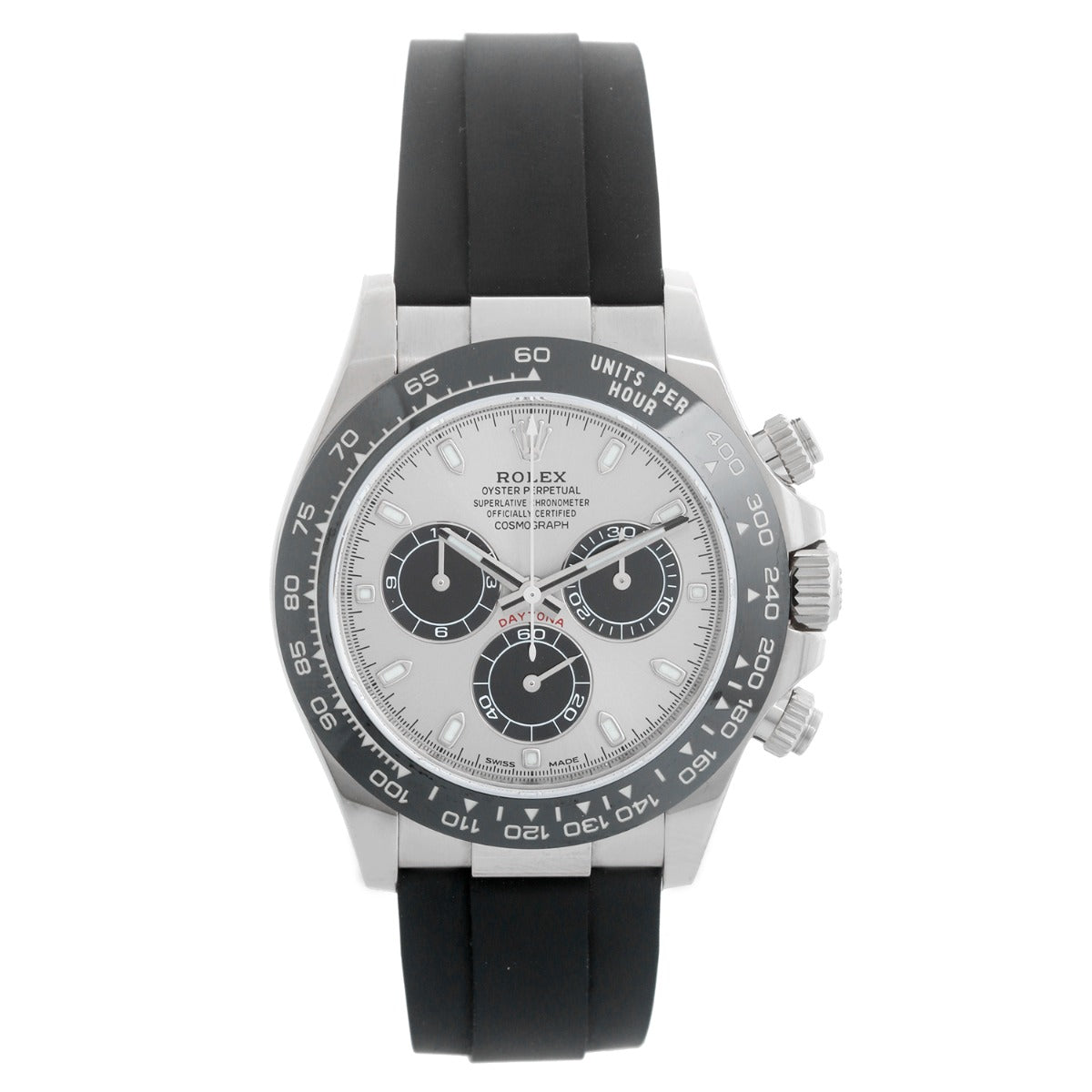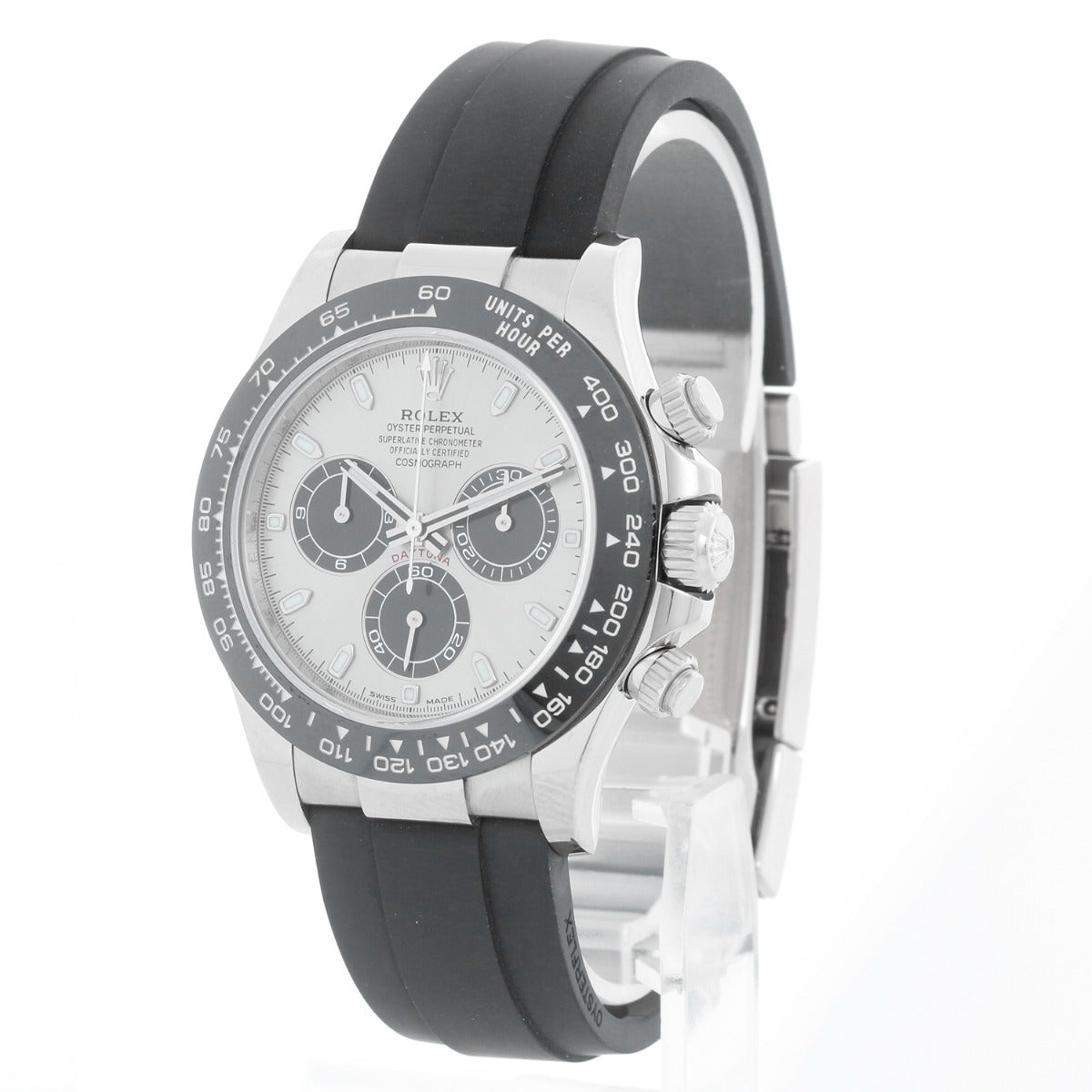 Rolex Cosmograph Daytona " Ghost " White Gold Watch 116519LN - Automatic winding, chronograph, 44 jewels, sapphire crystal. 18k white gold case with ceramic bezel (40mm diameter). Silver dial with black subdials. Oysterflex black rubber strap with Rolex 18k white gold deployant clasp. Pre-owned with Rolex box and papers. Dated 2022. Rolex factory warranty in effect until 2027