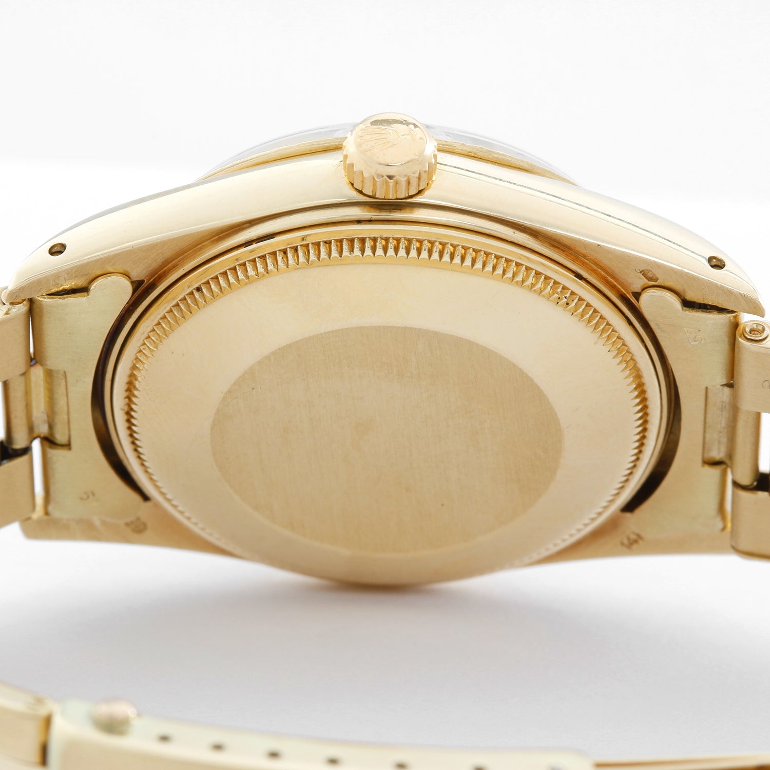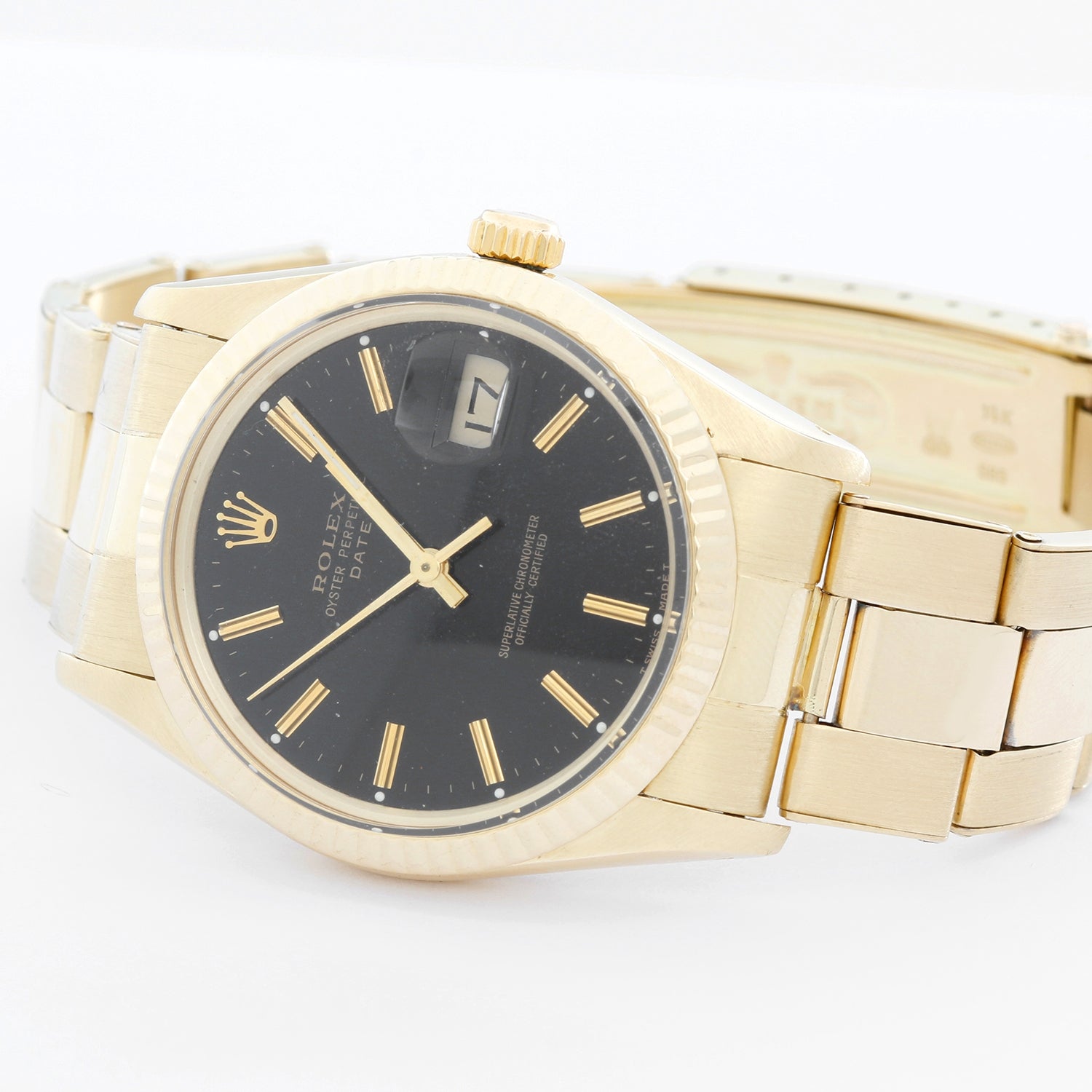 Rolex Date Men's 14k Yellow Gold Watch 15037 - Automatic winding. 14k yellow gold (34mm diameter). Black dial with yellow gold stick hour markers. 14k Oyster Yellow gold bracelet. Pre-owned with Rolex box .