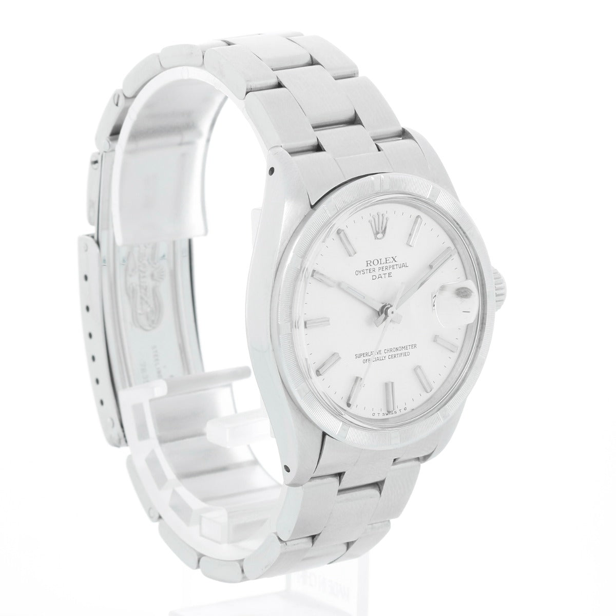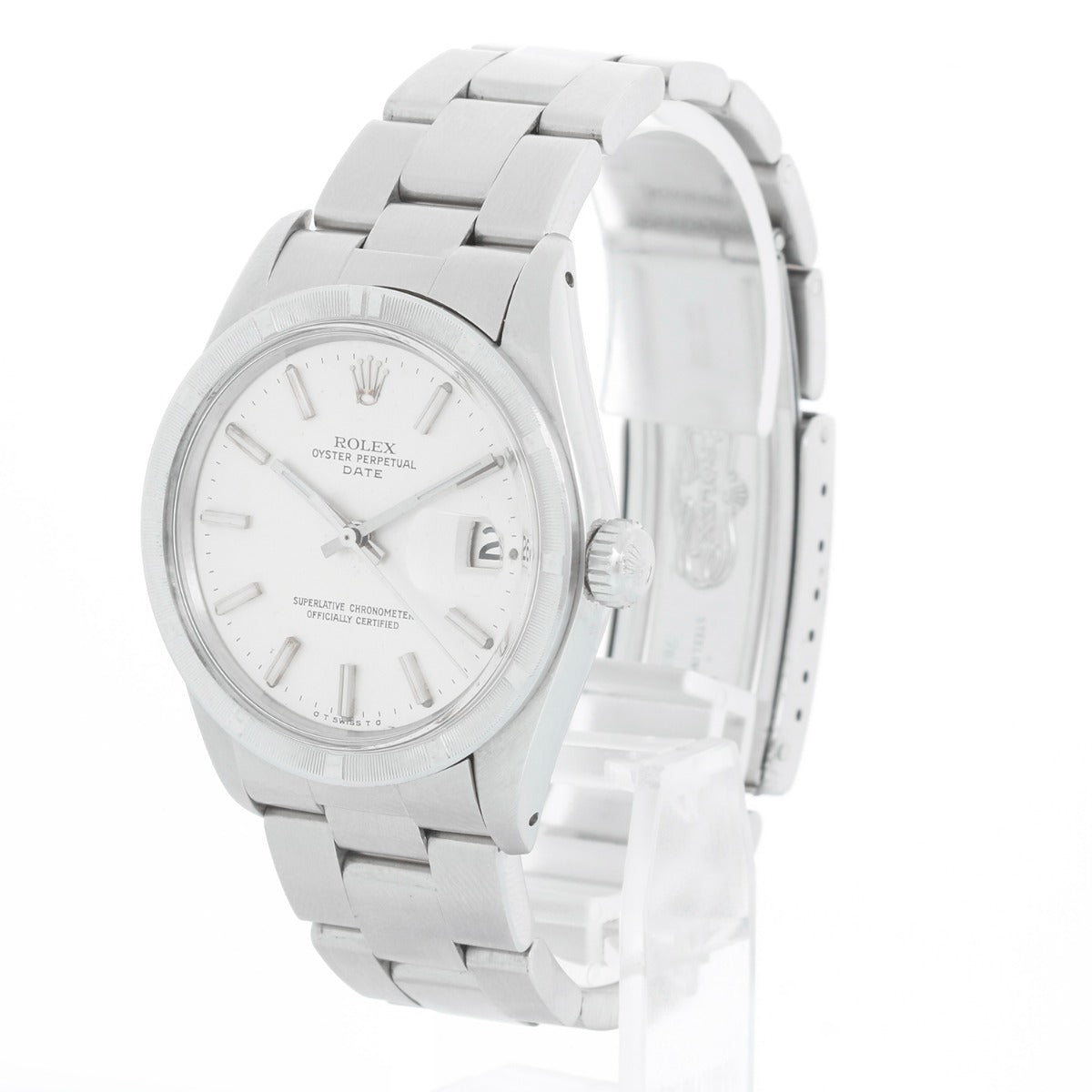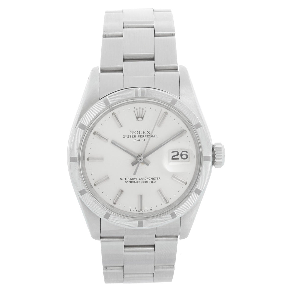 Rolex Date Men's Stainless Steel Watch 1501 - Automatic winding, 27 jewels, non-quickset, acrylic crystal. Stainless steel case with engine turn bezel (34mm diameter). Silver dial with stick hour markers. Stainless Steel Oyster Bracelet. Pre-owned with Demesy custom box. Circa 1974.