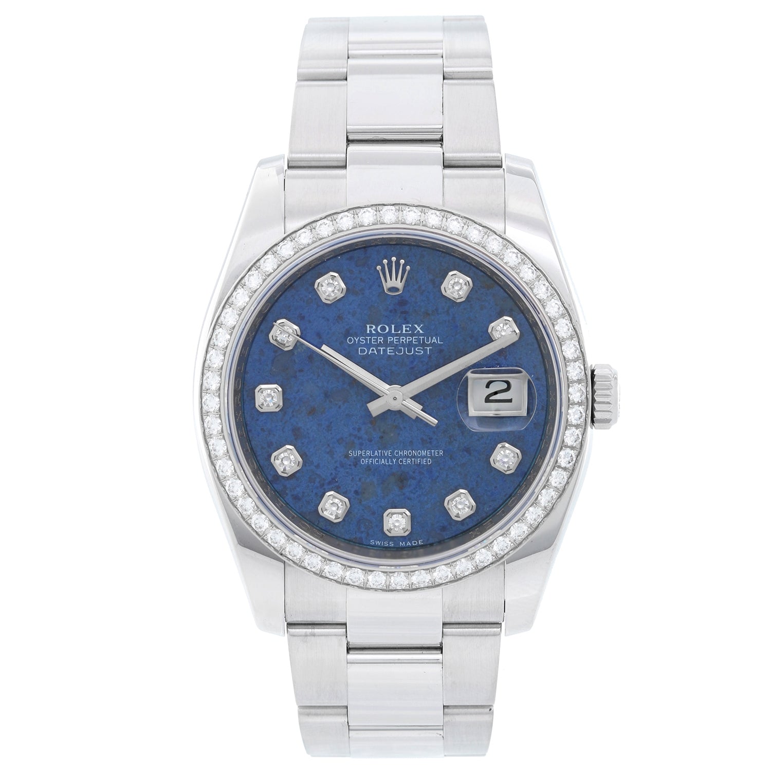 Rolex Datejust Diamond Bezel and Dial Men's Steel Watch 116244 - Automatic winding, 31 jewels, Quickset, sapphire crystal. Stainless steel case with factory 52 diamond and 18k white gold bezel (36mm diameter). Factory Sodelite diamond dial. Stainless steel oyster bracelet. Pre-owned with Rolex box and books.