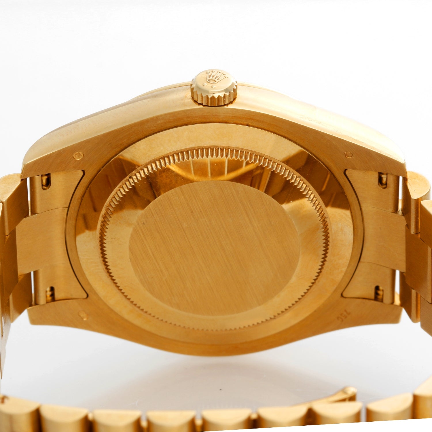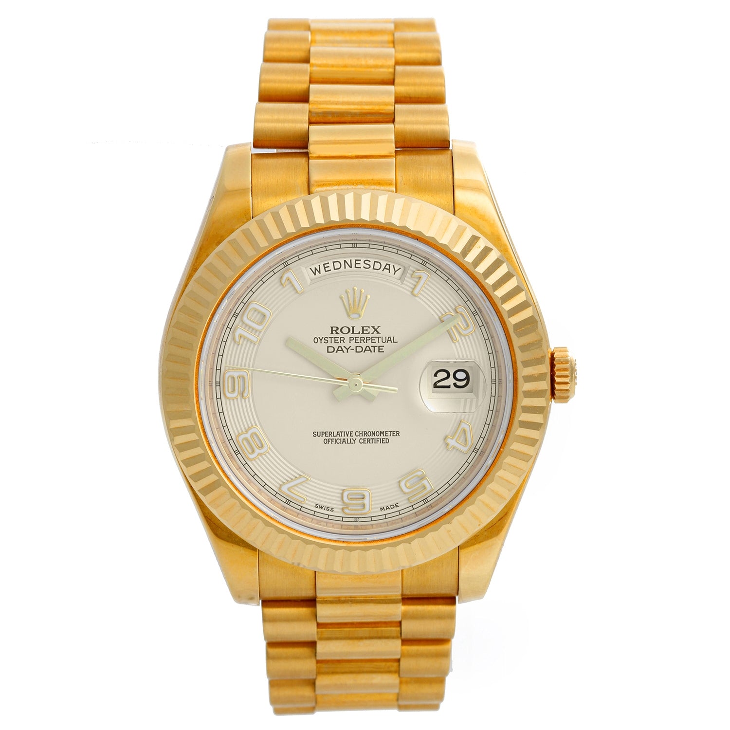 Rolex Day-Date II 41mm 18k Yellow Gold Men's President Watch 218238 - Automatic winding, 31 jewels, sapphire crystal, with day and date. 18k yellow gold case with fluted bezel (41mm diameter). Concentric cream dial . 18k yellow gold President bracelet. Pre-owned with Rolex box and books