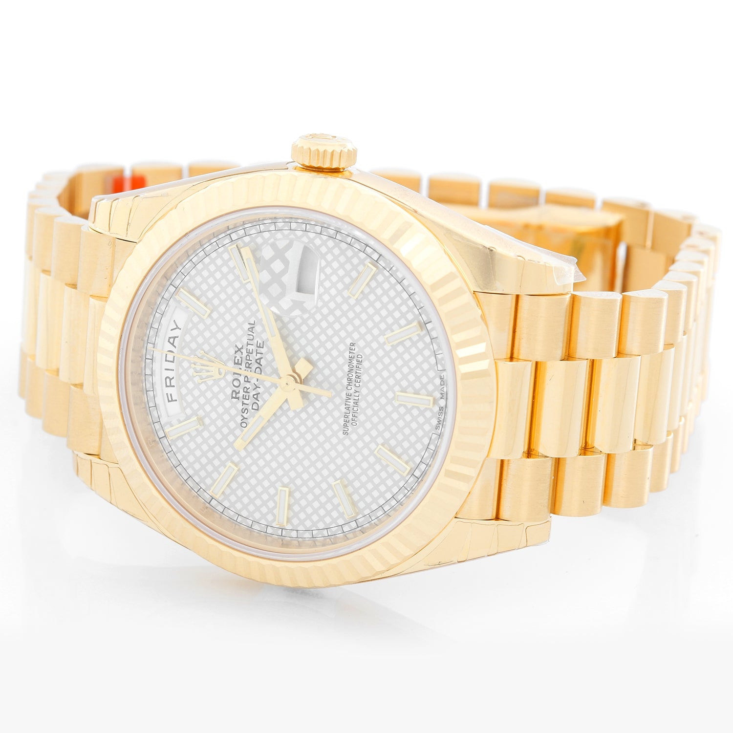 Rolex Day-Date 40 President 18k Yellow Gold Men's 40mm Watch 228238 - Automatic winding, 31 jewels, sapphire crystal, with day and date. 18K Yellow gold; fluted bezel (40mm diameter). Silver diagonal motif dial. 18k yellow gold President bracelet. Unused with Rolex box and card.