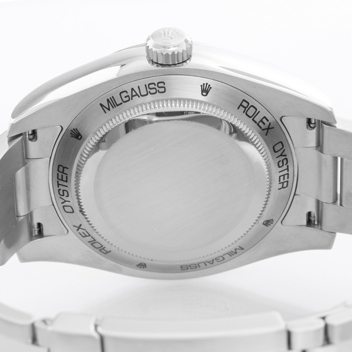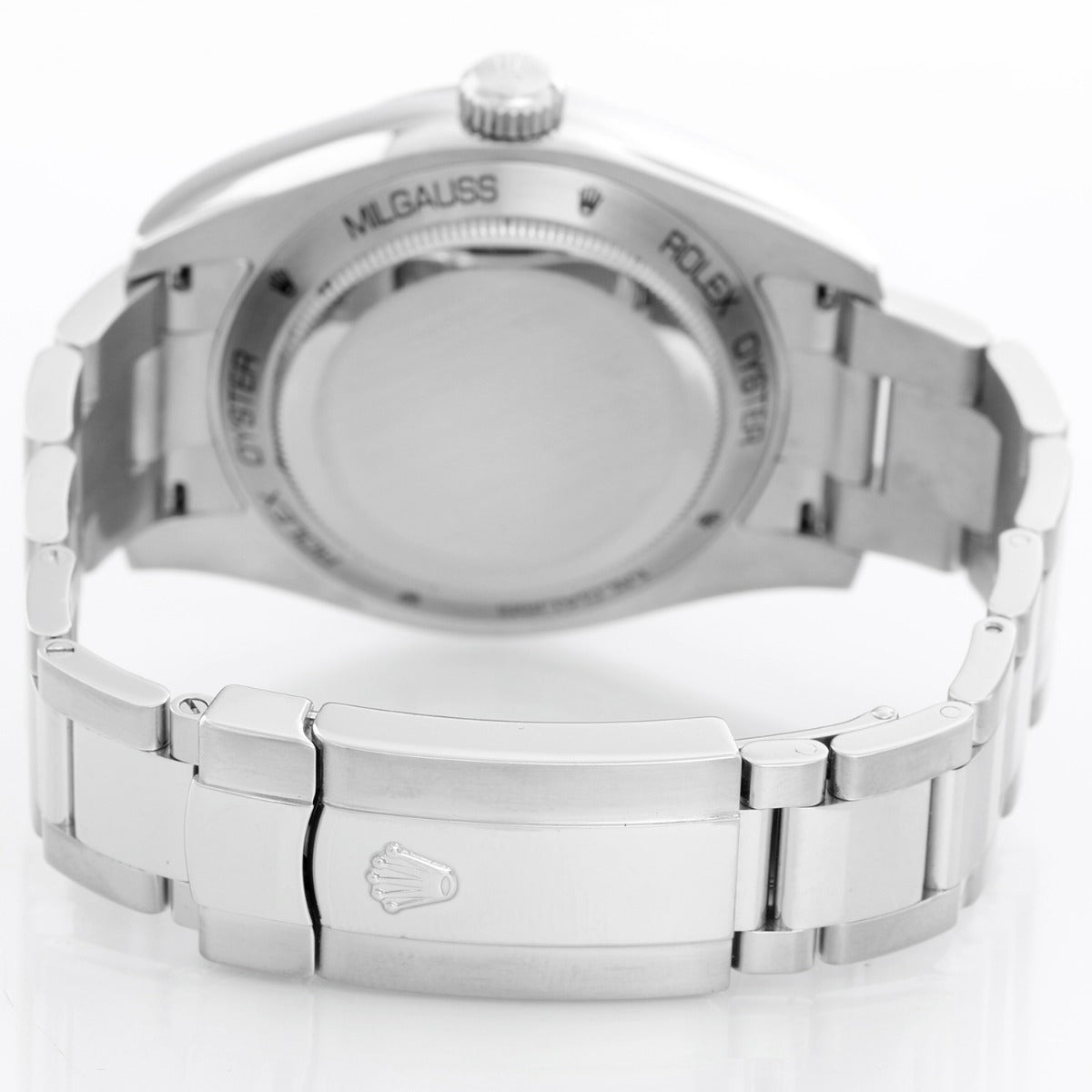 Rolex Green Milgauss Crystal Anniversary Model 116400GV - Automatic winding, green sapphire crystal, 31 jewels. Stainless steel case with smooth bezel (40mm diameter). Black dial with luminous style and orange markers. Stainless steel Oyster bracelet with flip-lock clasp. Pre-owned with Rolex travel box and books.