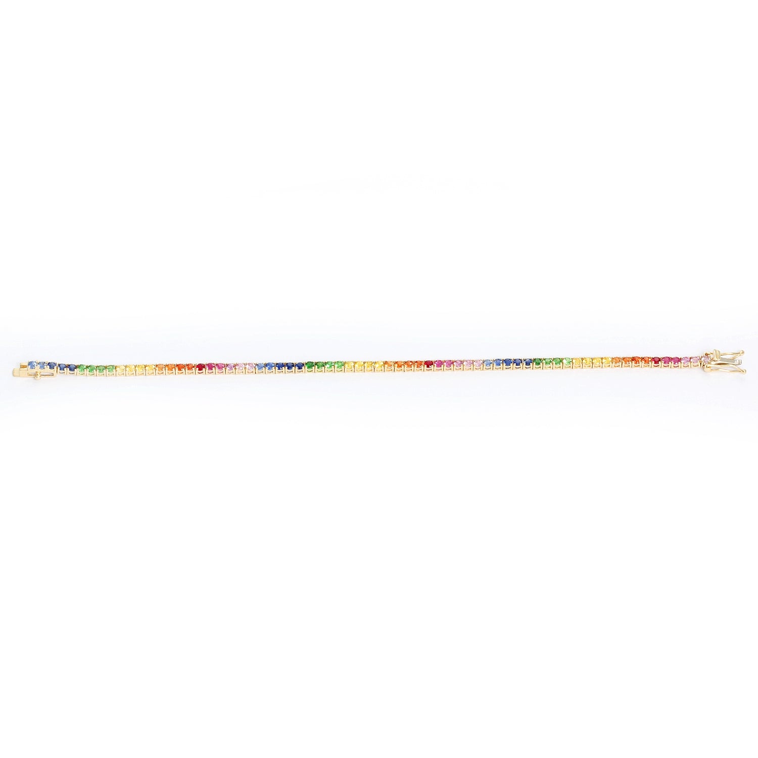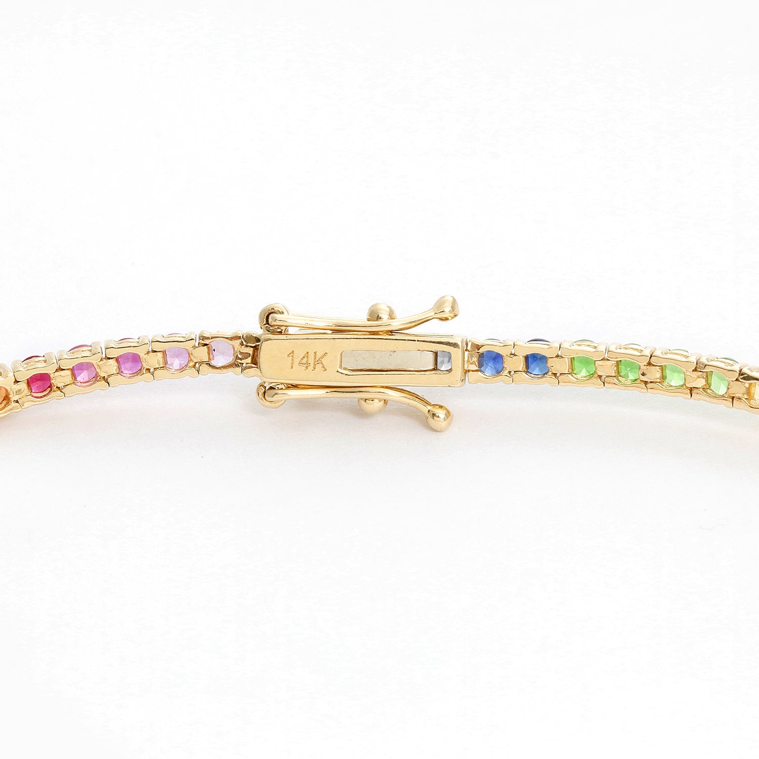 14K Yellow Gold Rainbow Sapphire Bracelet - Beautiful 4.08 cts of rainbow Sapphires. This tennis bracelet features a multicolored gradient of 2.37mm round brilliant sapphires. Total weight 6.5 grams. Wrist size up to 7 inches .