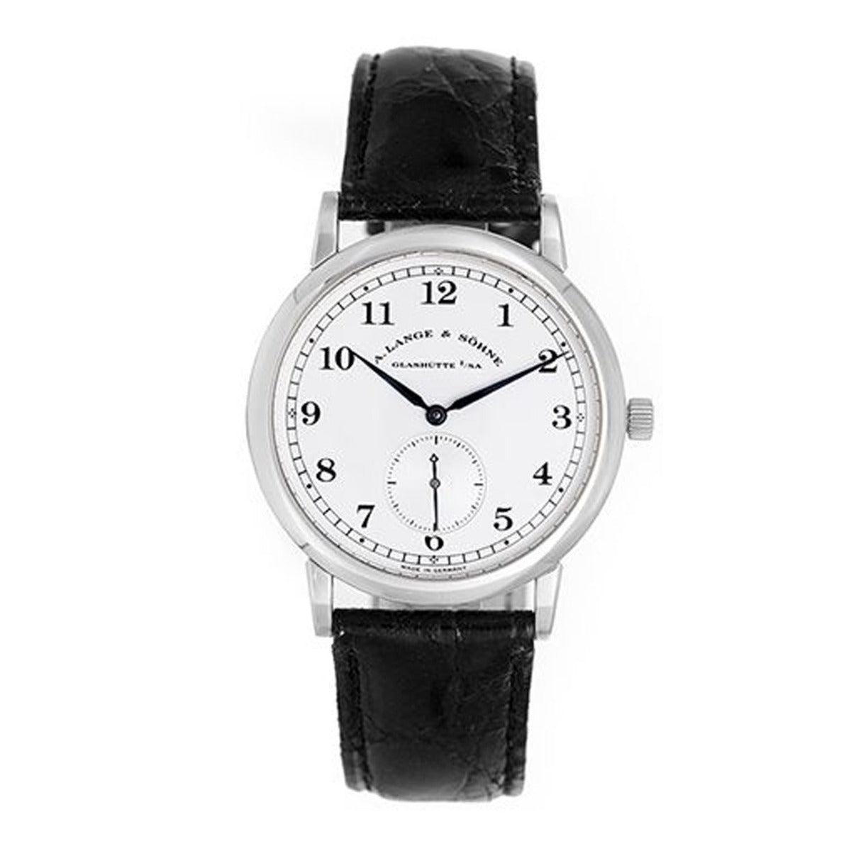 A. Lange & Sohne 1815 Men's Platinum Watch 206.025 - Manual winding. Platinum case with exhibition back (36mm diameter). Silver dial with Arabic numerals; sub-seconds dial. Black croc strap band with platinum Lange buckle. Pre-owned with custom box.