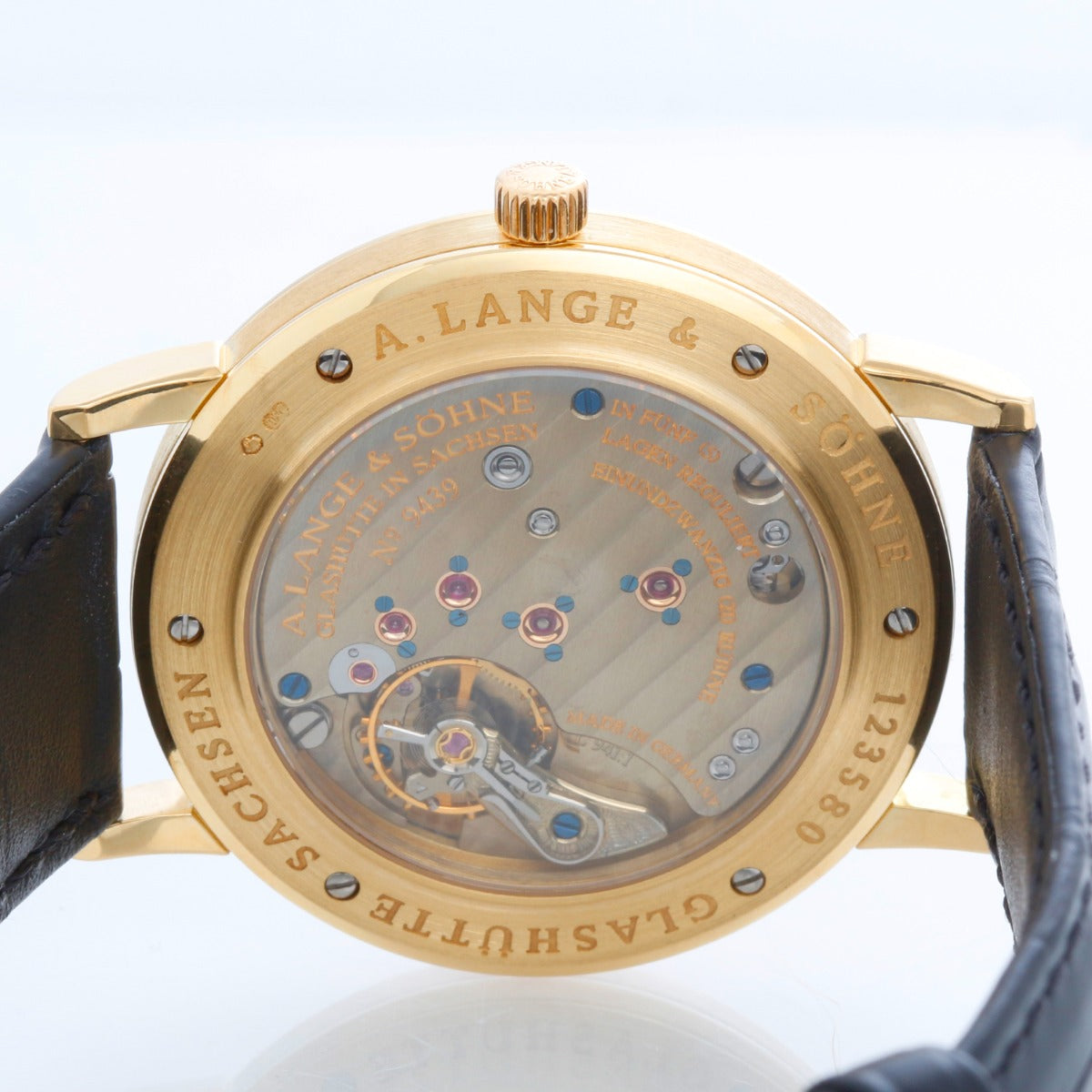 A. Lange & Sohne 1815 Men's Yellow Gold Watch 206.032 - Manual winding. Yellow Gold case with exhibition back (36mm diameter). Silver dial with Arabic numerals; sub-seconds dial. Black croc strap band with yellow gold Lange buckle. Pre-owned with custom box.