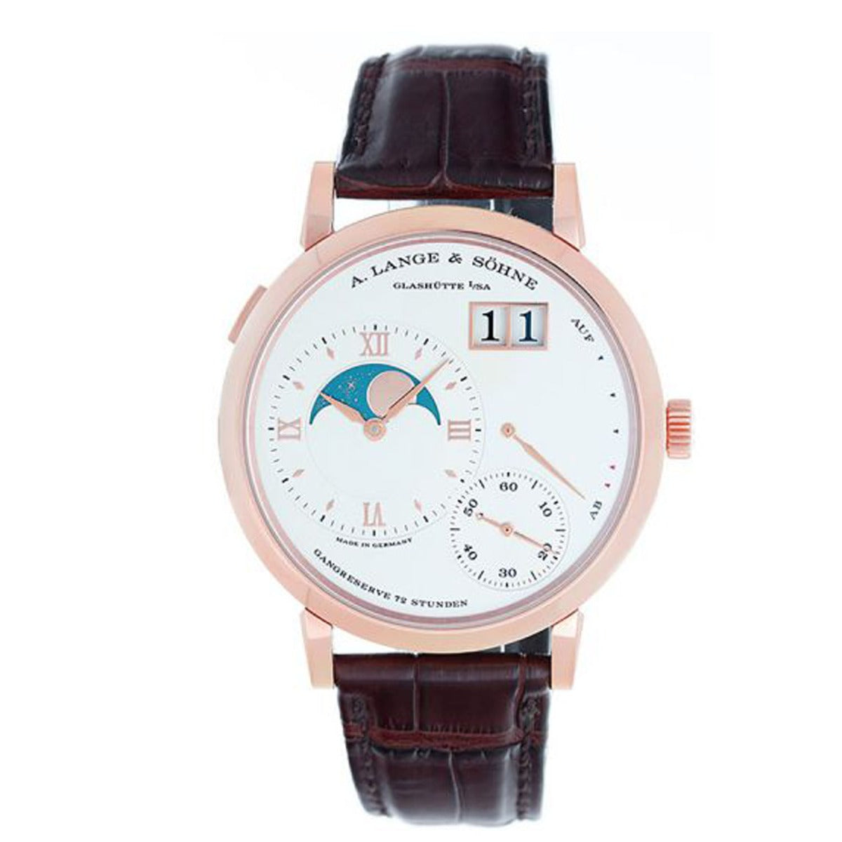 A. Lange & Sohne Grand Lange 1 Moonphase 41mm Men's Rose Gold Watch 139.032 - Automatic winding. 18k rose gold case (41mm diameter). Silver dial with hour and minute subdials offset to left. Hour subdial has the moonphase center; big date with quick correction button at 10 o'clock position on the case edge; power reserve indicator. Dark brown strap band and 18k rose gold A. Lange & Sohne buckle. Pre-owned with box and papers (original sale date March 2015).