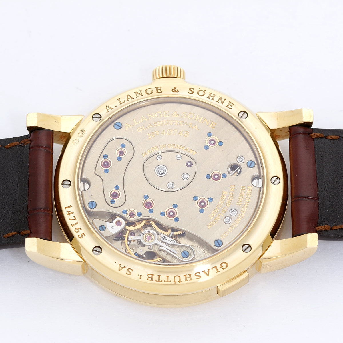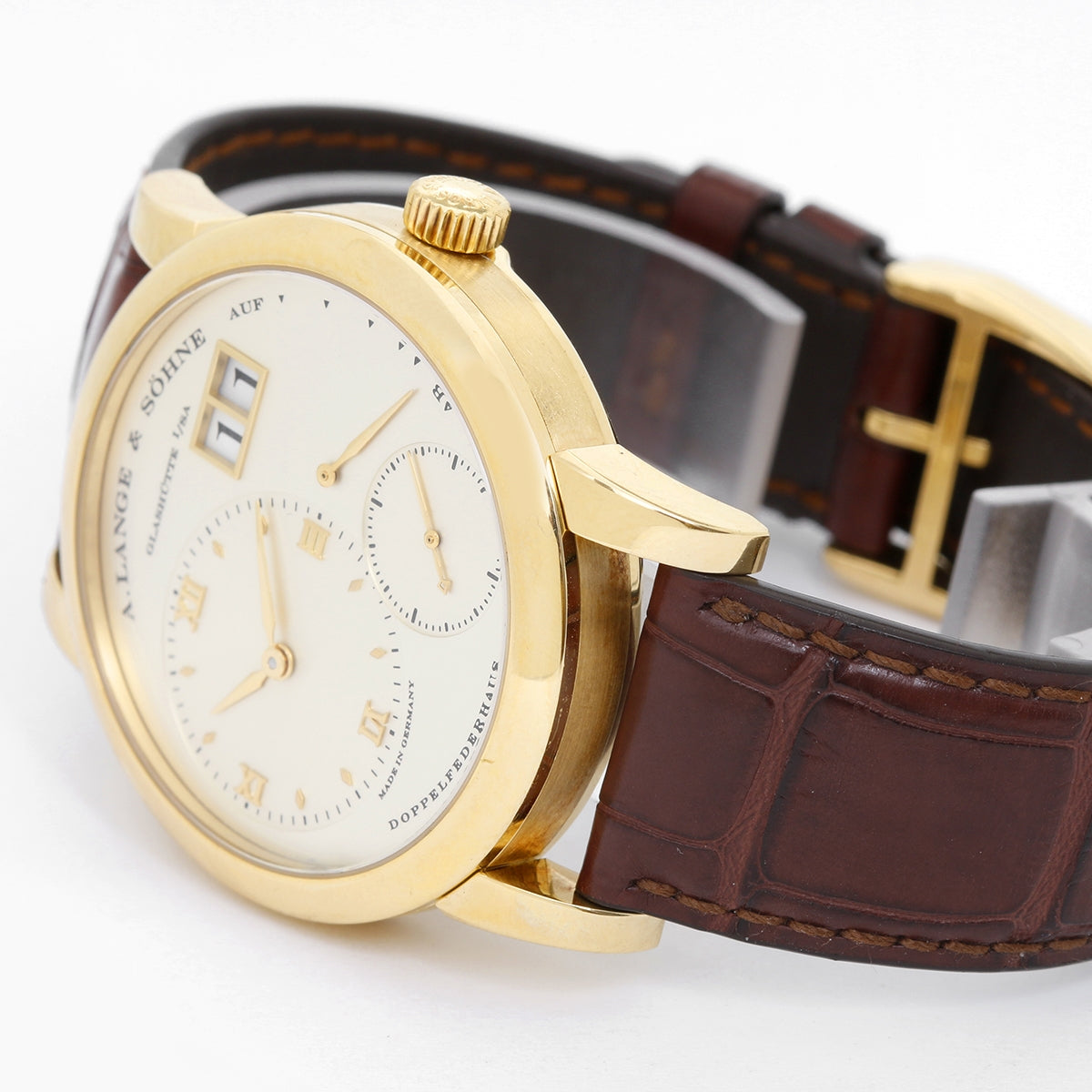 A. Lange & Sohne Lange 1 Yellow Gold Men's Power Reserve Big Date Watch 101.022 - Manual winding. Yellow gold case with exposition back (39 mm diameter). Silver dial with offset time dial with Roman numerals; subseconds, power reserve indicator; big date. Strap band with a gold A. Lange tang buckle. Pre-owned with A. Lange & Sohne box and books.