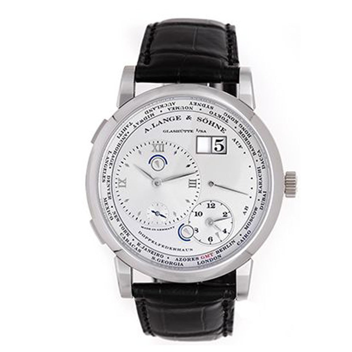 A. Lange & Sohne Lange 1 Time zone Men's Platinum Watch 116.025 - Manual winding. Platinum case with exposition back (40mm diameter). Rhodium dial with large date display; hours, minutes, subsidiary seconds and second time zone displays; day/night indicators for both time zones. Strap band with platinum A. Lange & Sohne buckle. Pre-owned with box and papers.