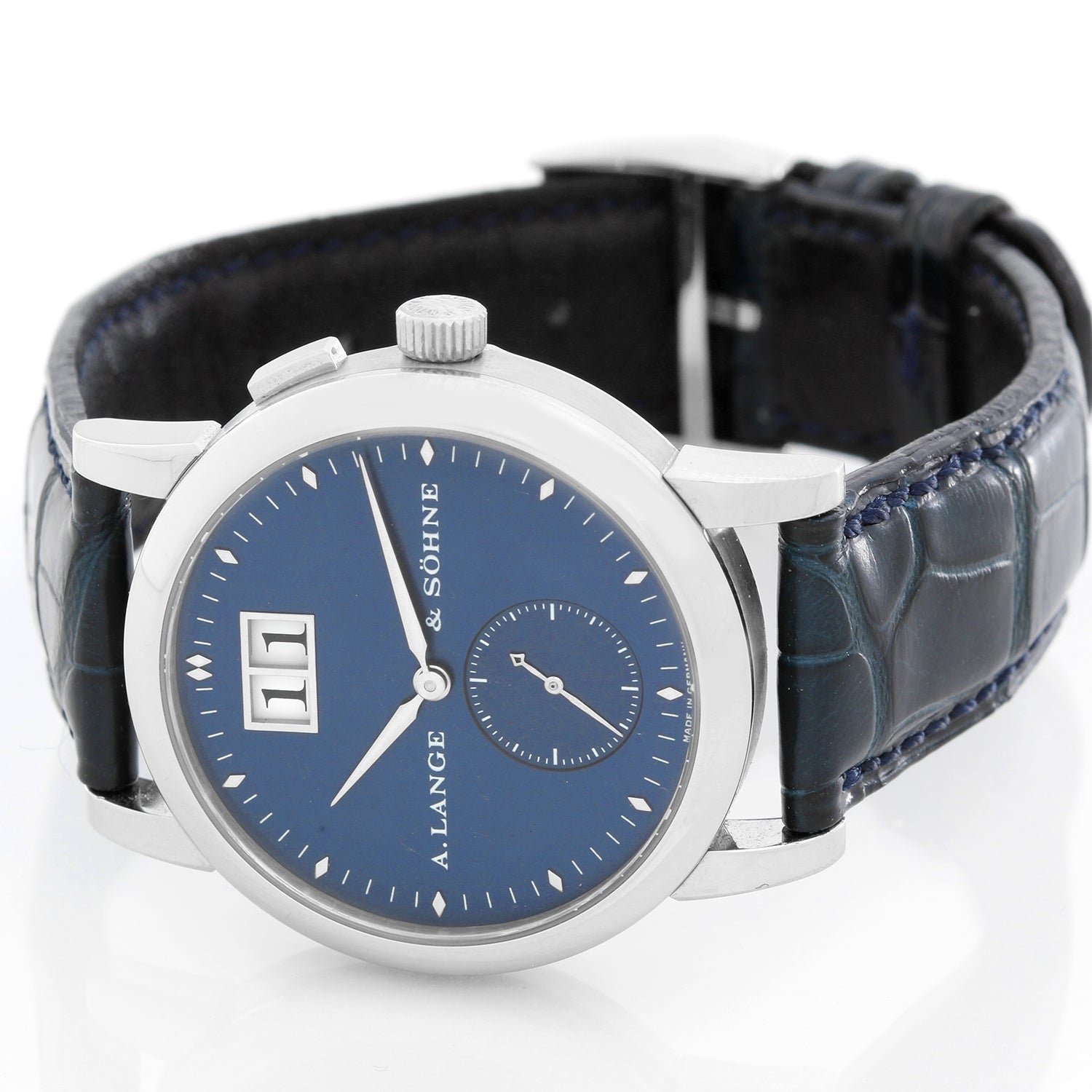 A. Lange & Sohne Saxonia 18K White Gold Ref. 105.027 Watch - Manual winding. 18K White Gold ( 34 mm ). Blue dial with stick hour markers; big date at 12 o'clock. A. Lange & Sohne Blue alligator strap with A. Lange tang buckle. Pre-owned with A. Lange & Sohne box .