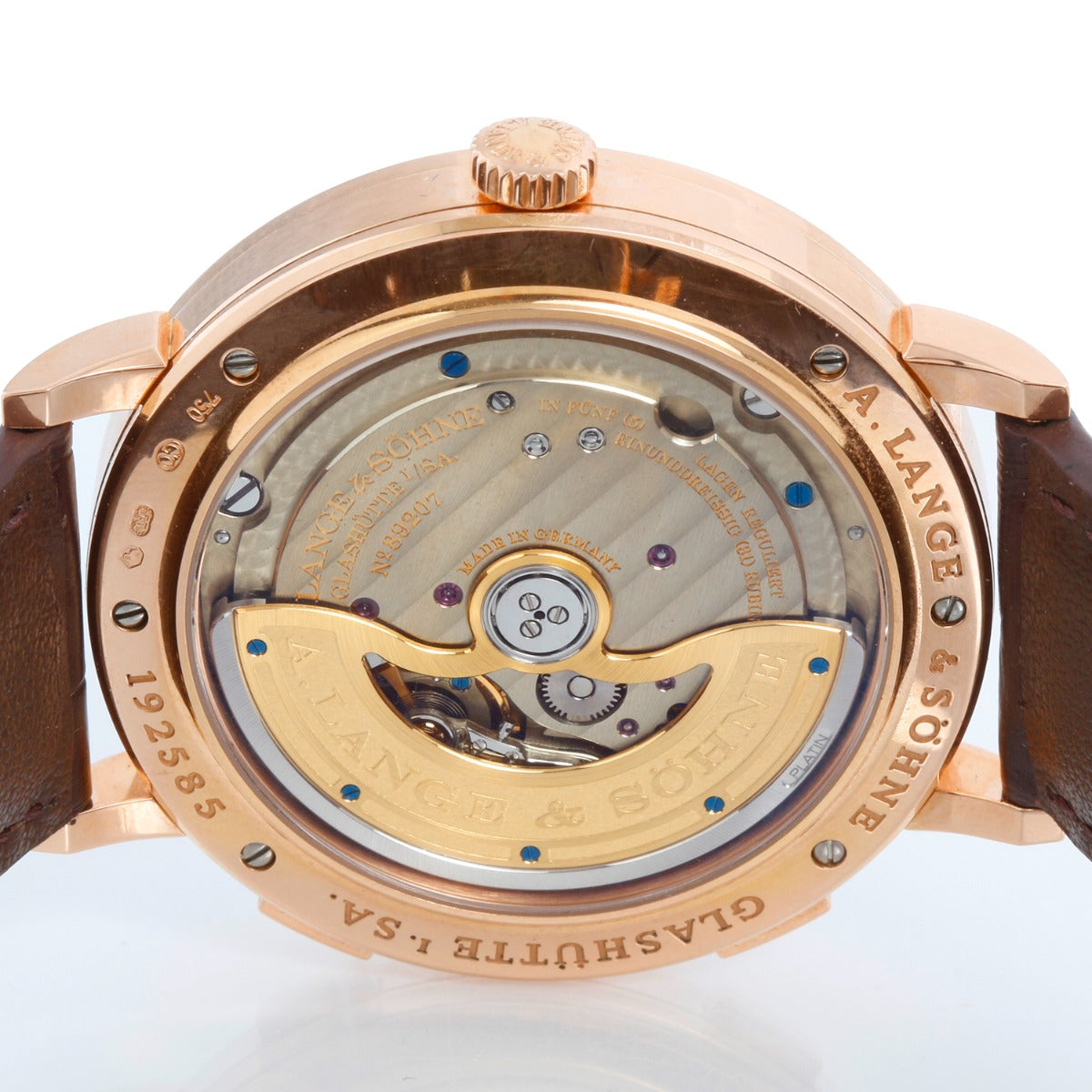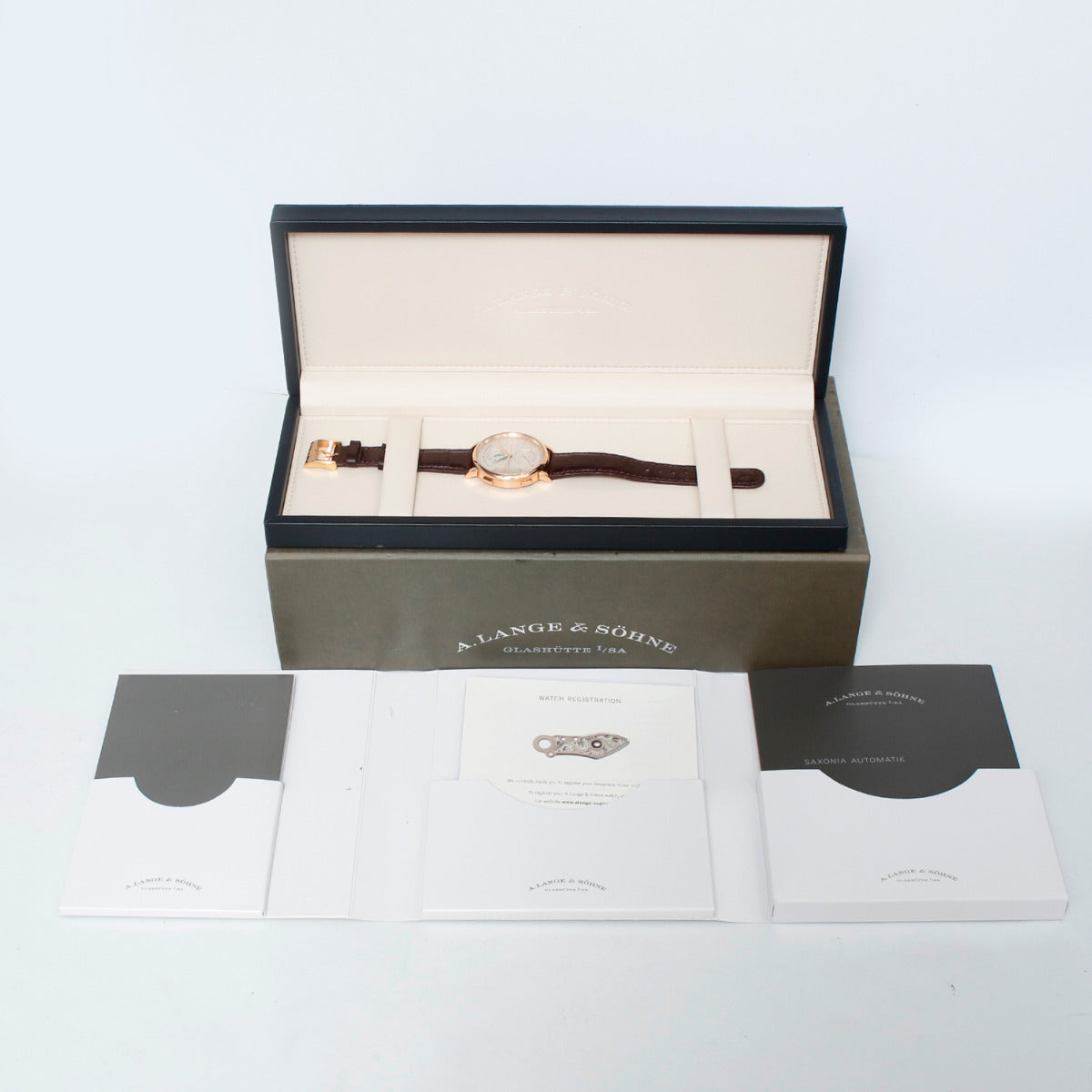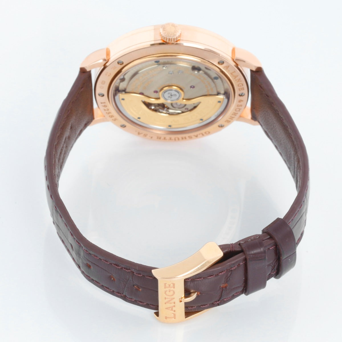 A. Lange & Söhne Saxonia Dual Time Rose Gold Watch 385.032 - Automatic winding ; 72 hours of power reserve; caliber l086.2. 18K Rose gold ( 40 mm). Silver dial with subdials. Brown leather strap with 18K Rose gold A. Lange & Sohne tang buckle. Pre-owned A. Lange box and book.