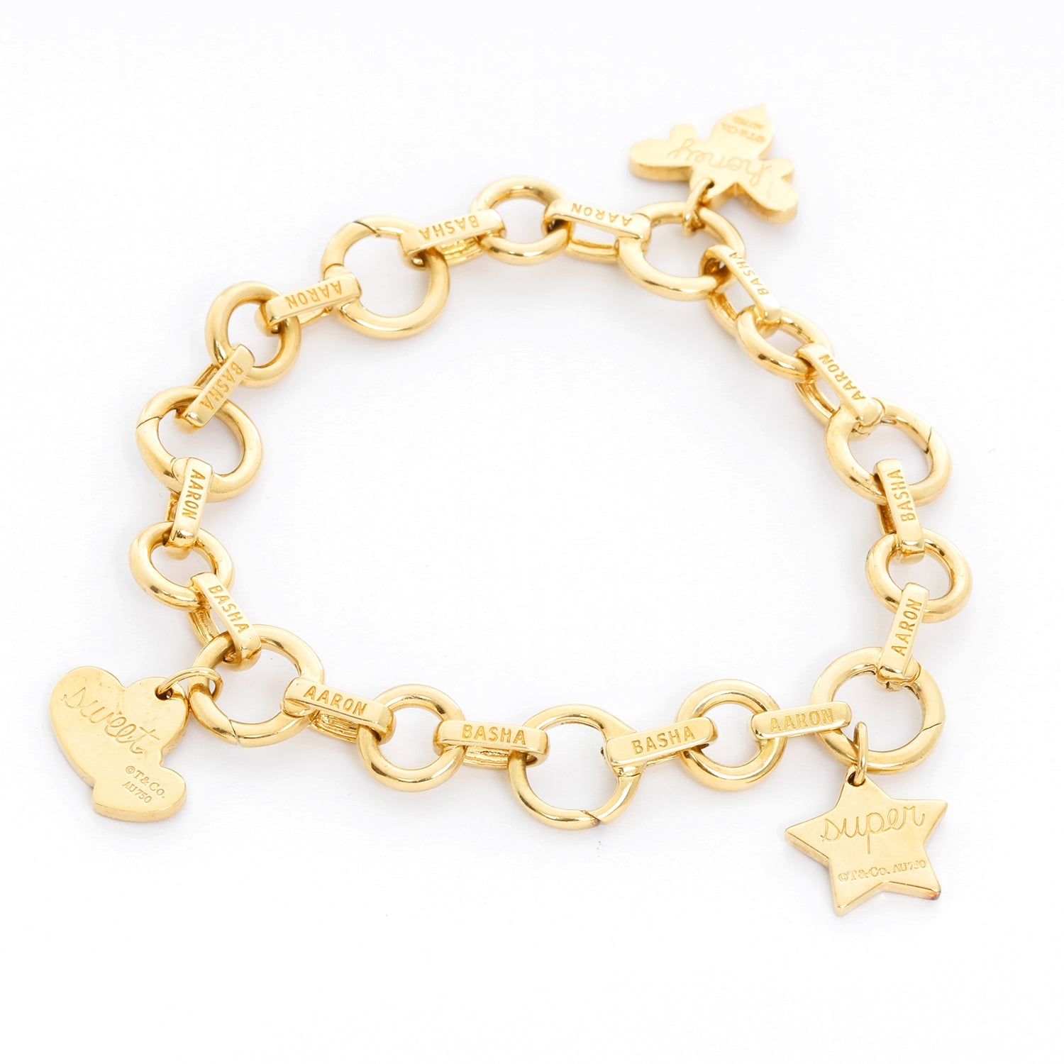 Aaron Basha Open Link Charm Bracelet with Tiffany & Co. Charms - 18K Yellow Gold Bracelet with small open links ( 7 ) for charms. Wrist size 6 3/4 inches. Total weight 24.4 grams. Hallmarked on each link AAron Basha. Includes three Tiffany & Co. charms - Honey bee, Super star, Sweet heart - All 14K Yellow gold stamped Tiffany & Co.