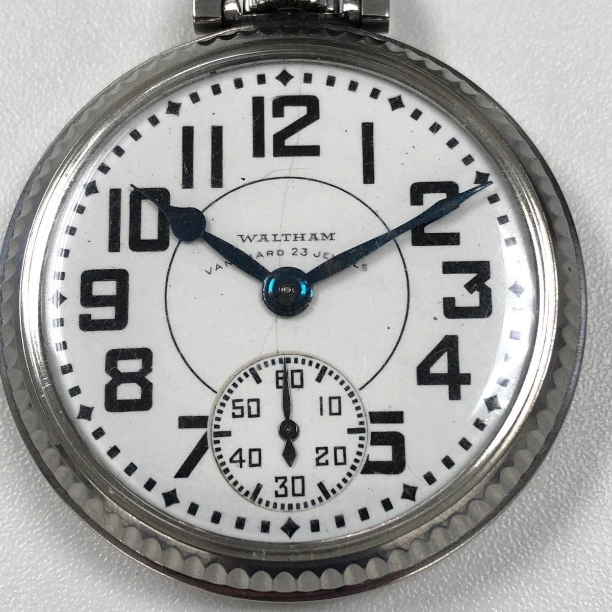 American Watch Co. Waltham Pocket Watch Model 1908 "Railroad Grade" - Manual winding; 23 jewels. Stainless Steel ( 50 mm) . White dial with roman numerals and sub dial at 6 oclock. Comes with stainless steel pocket watch chain, measuring 14 inches in length Pre-owned with custom box. Grade: No. 1623. Circa August 1937 .
