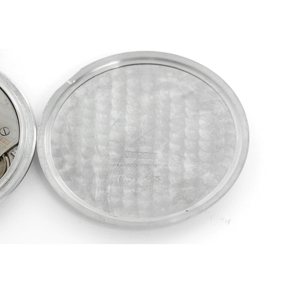 Audemars Piguet Art Deco Ultra Thin Pocket Watch - Manual winding. Platinum case ( 42 mm ). Silver dial signed Audemars Piguet & Co. applied baton and Arabic numerals. Pre-owned with custom box. Early 30's edition.