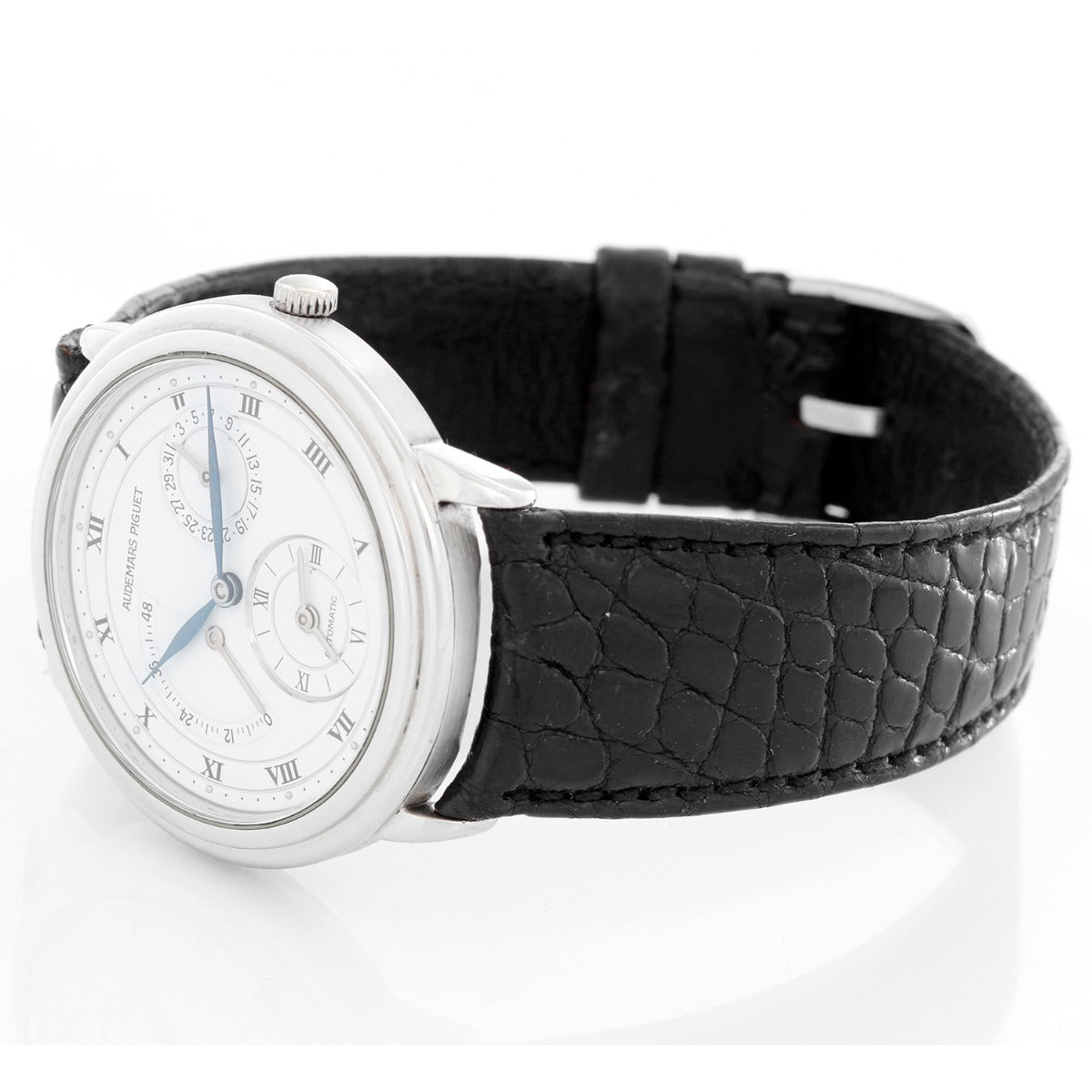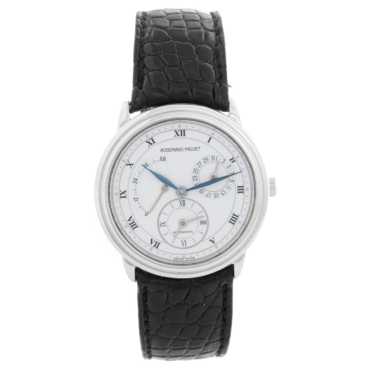 Audemars Piguet Jules Audemars Men's Platinum Power Reserve Dual Time Watch 25685PT - Automatic winding (35 jewel) Power reserve, dual time zone, date. Platinum case (36mm). White dial with Roman numerals, power reserve indicator and date at 3 o'clock subdial. Black croc strap with Audemars Piguet tang clasp . Pre-owned with Audemars Piguet box.