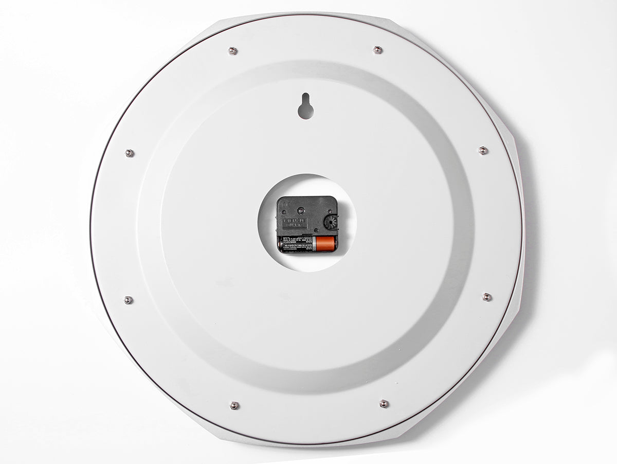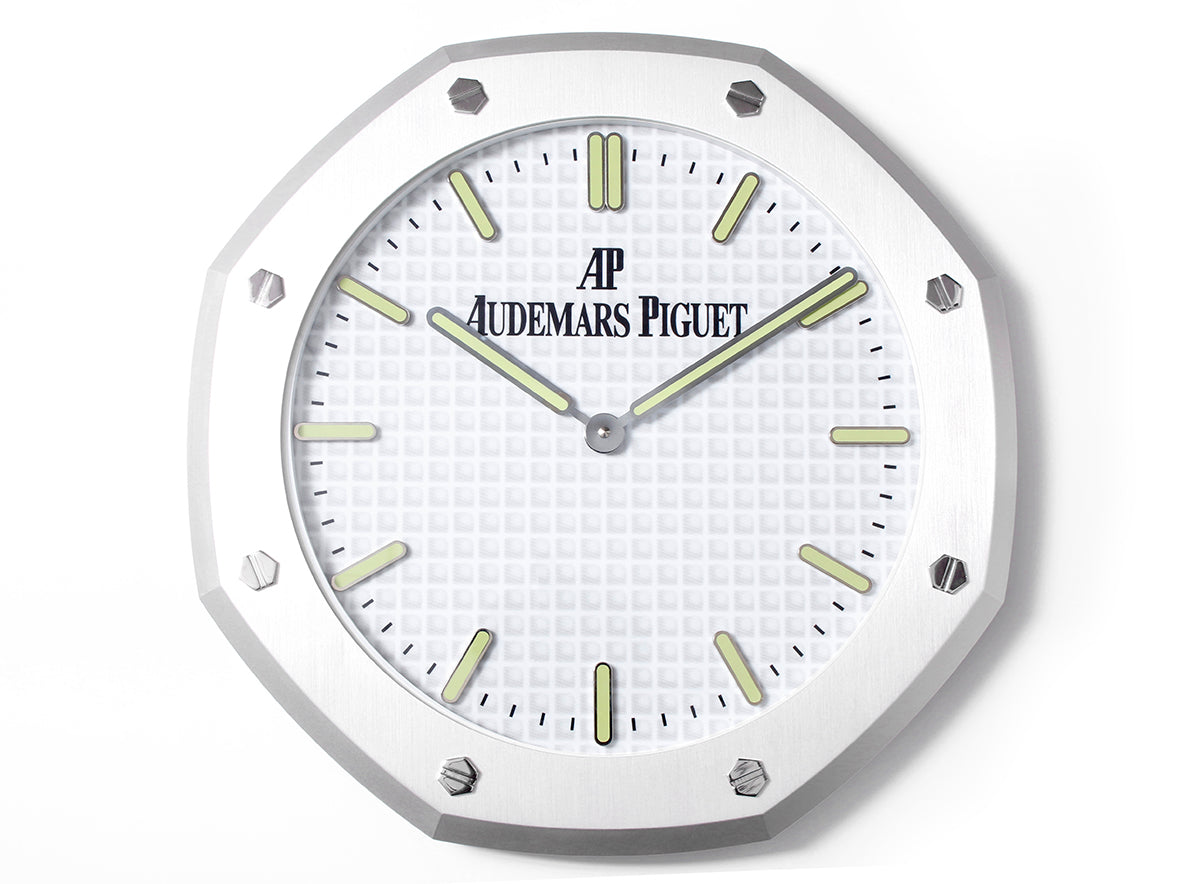 Audemars Piguet Royal Oak Clock - Quartz. Stainless steel (15" diameter). White tapisserie with luminescent material batons and hands. pre-owned with box.