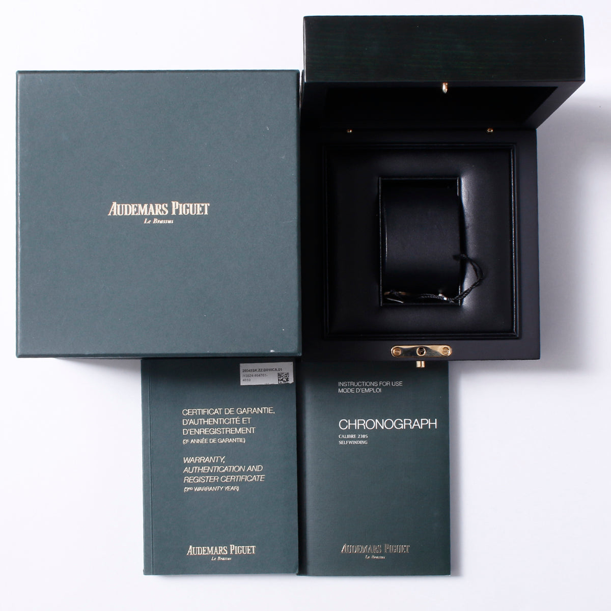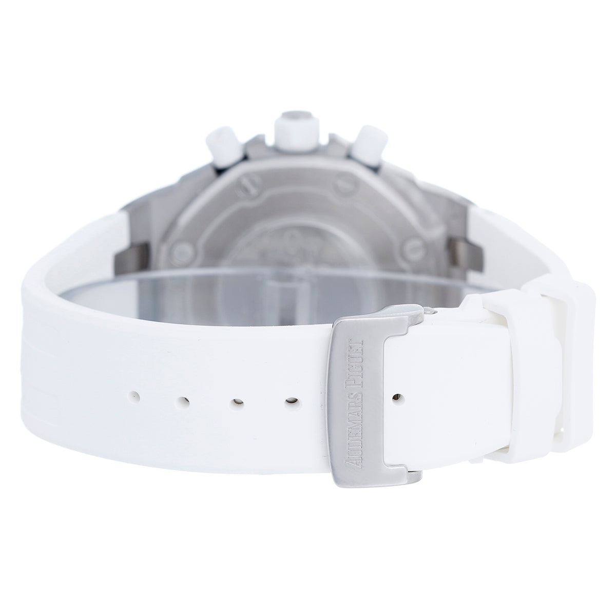 Automatic winding, chronograph. Stainless steel, white rubber and 32 diamond, 1.37ct., bezel (38mm in diameter). Silver textured with hour, minute, and second recorders. Black Arabic numerals. Audemars Piguet white rubber strap band and stainless steel deployant clasp. Pre-owned with box and papers. Just back from Audemars Piguet full service.