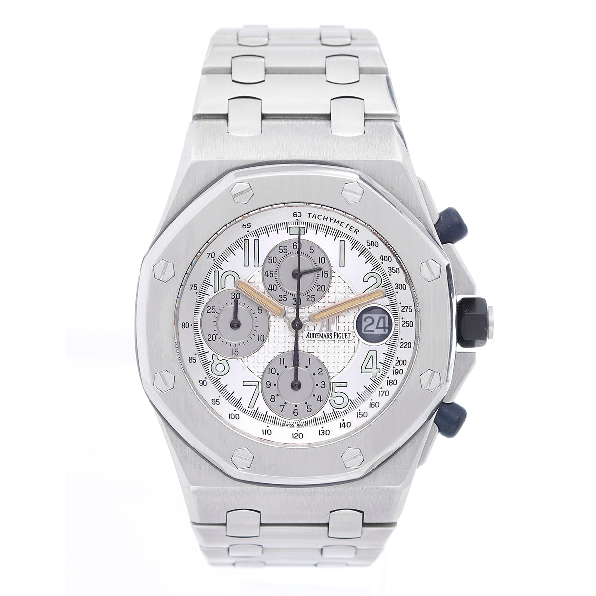 Audemars Piguet Royal Oak Offshore Chronograph Stainless Steel Men's Watch - self winding, chronograph with Tachymeter. Stainless steel case (42mm diameter). Silver waffle dial with date; hour, minute and seconds recorders. Stainless steel Royal Oak bracelet. Pre-owned with box.