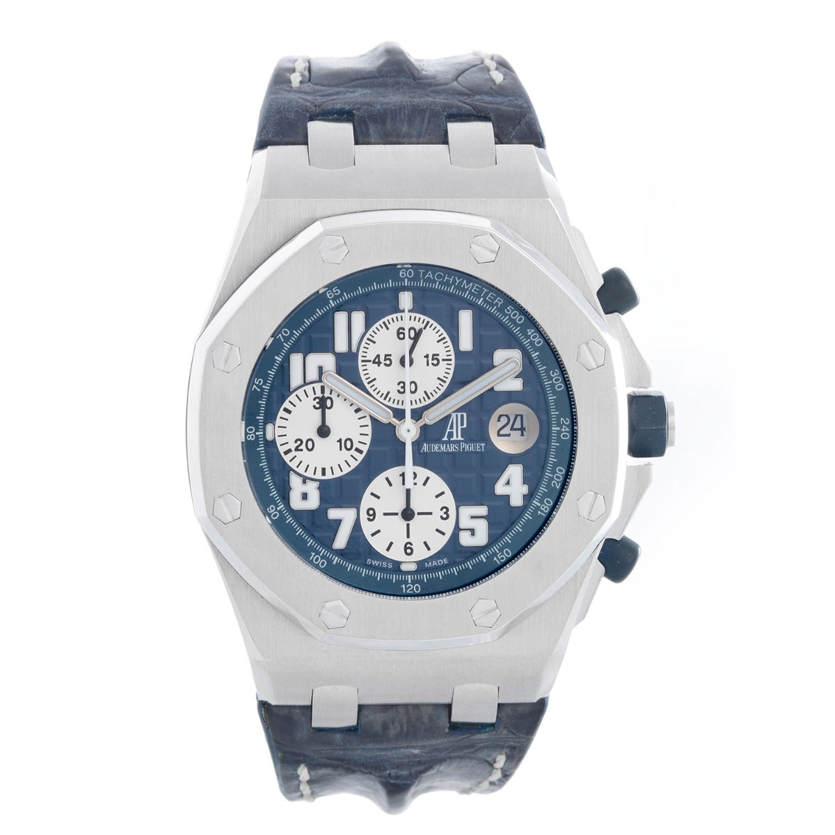 Audemars Piguet Royal Oak Porto Cervo Men's Steel Watch 26188ST.00.D305CR.01 - Automatic Movement with Chronograph & Date. Stainless steel case (44 mm diameter). Blue waffle dial. Blue Audemars Piguet strap with Audemars Piguet stainless steel buckle. Pre-owned with Audemars Piguet box. Special edition 35/75.