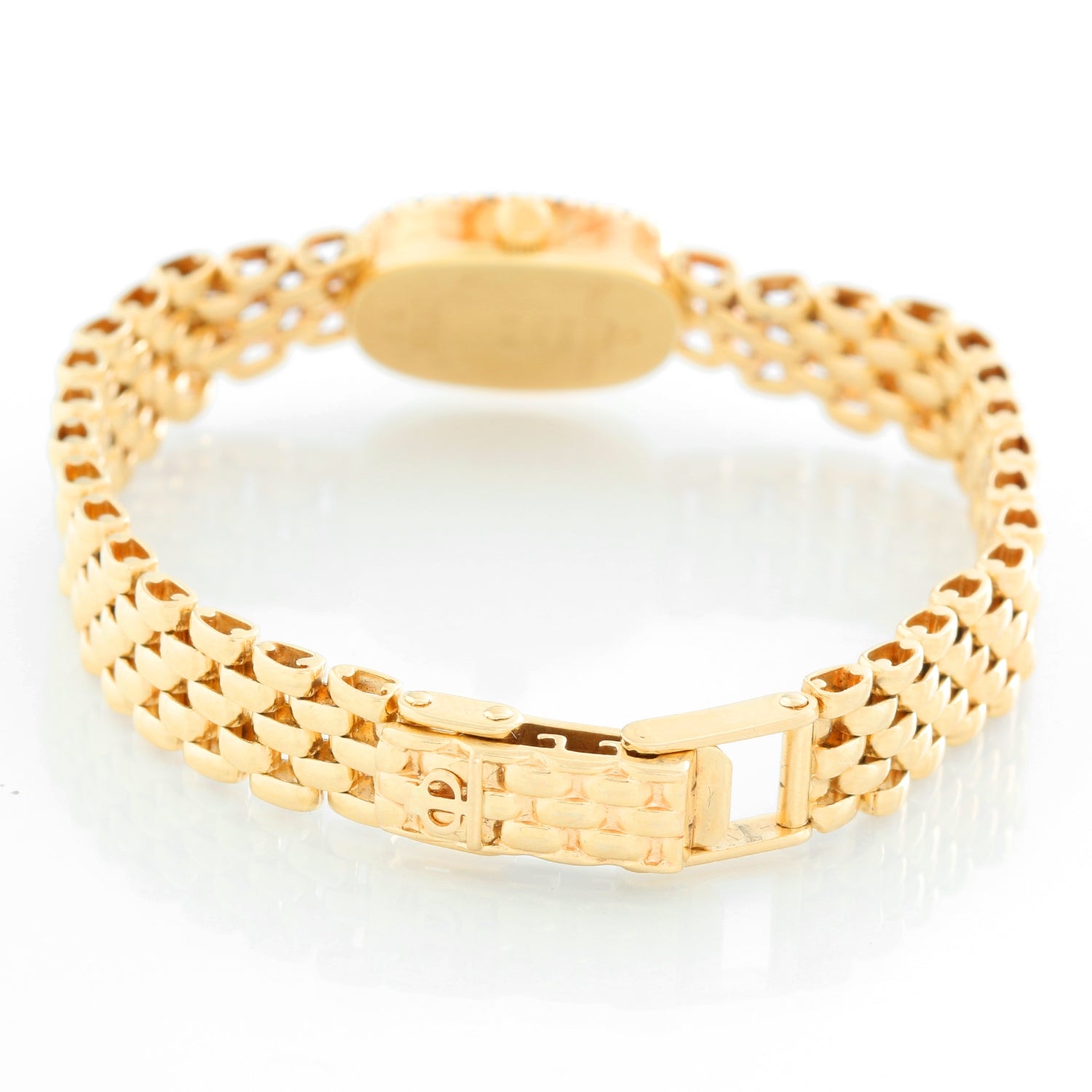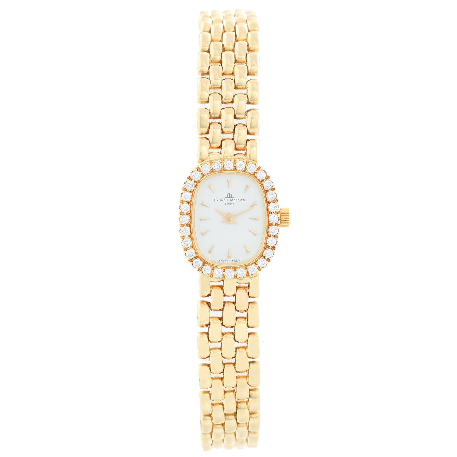 Baume & Mercier 18K Yellow Gold Diamond Watch - Quartz. 18K Yellow gold with diamonds on bezel ( 24 mm ). White dial with raised gold Roman numerals. 18K Yellow gold link bracelet; Will fit a 7 inch wrist . Pre-owned with custom box.