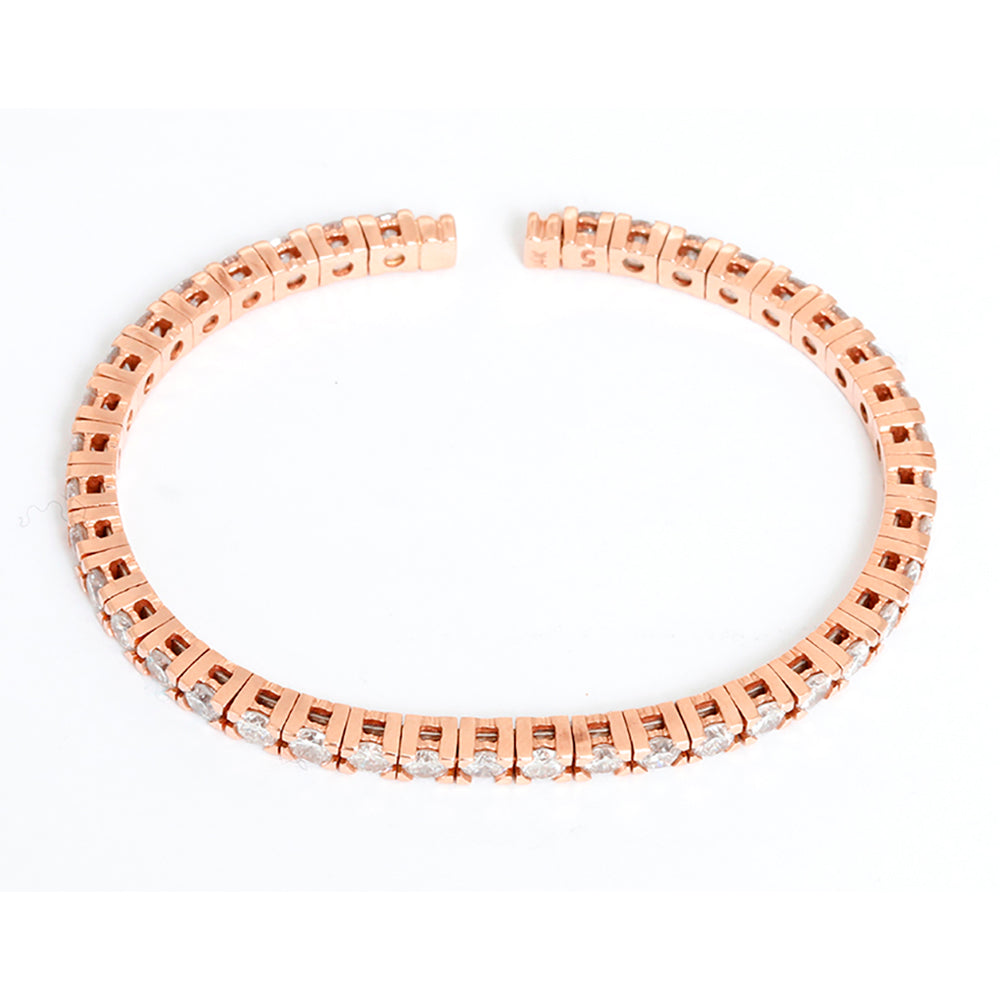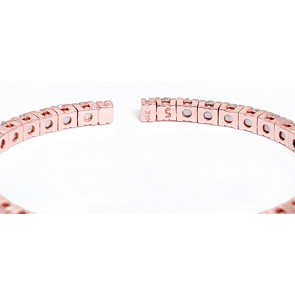 This amazing cuff bracelet features 40 (5.35 ctw.) stones that are SI1-SI2 clarity and H-I color set in 14k rose gold. The cuff fits apx. a 6-1/2 inch wrist. Total weight is 16.2 grams. This bracelet can be worn alone or stacked with other bracelets and is perfect for any look!