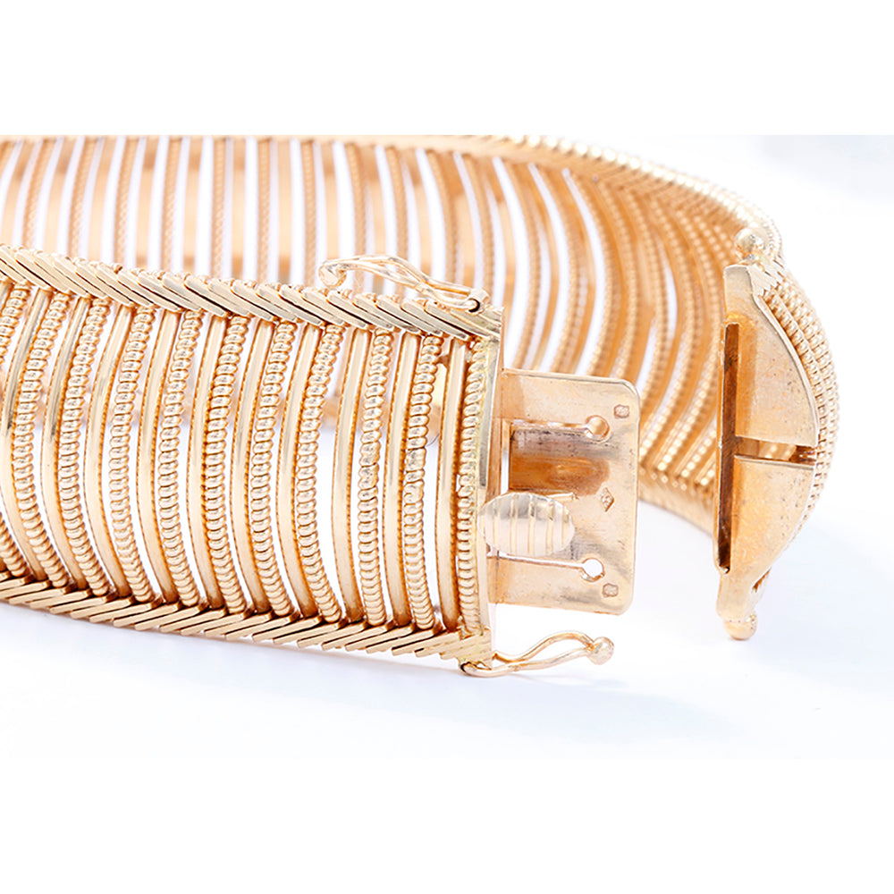 This yellow gold bracelet features multi-textures. It measures apx. 7-1/2 inches in length and apx. 15/16 -inch in width. Total weight is 59.5 grams. This bracelet can go from day to night and looks great with any look!