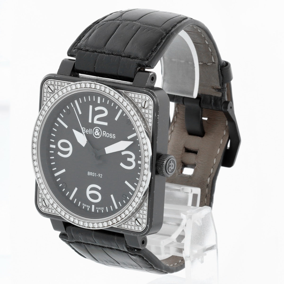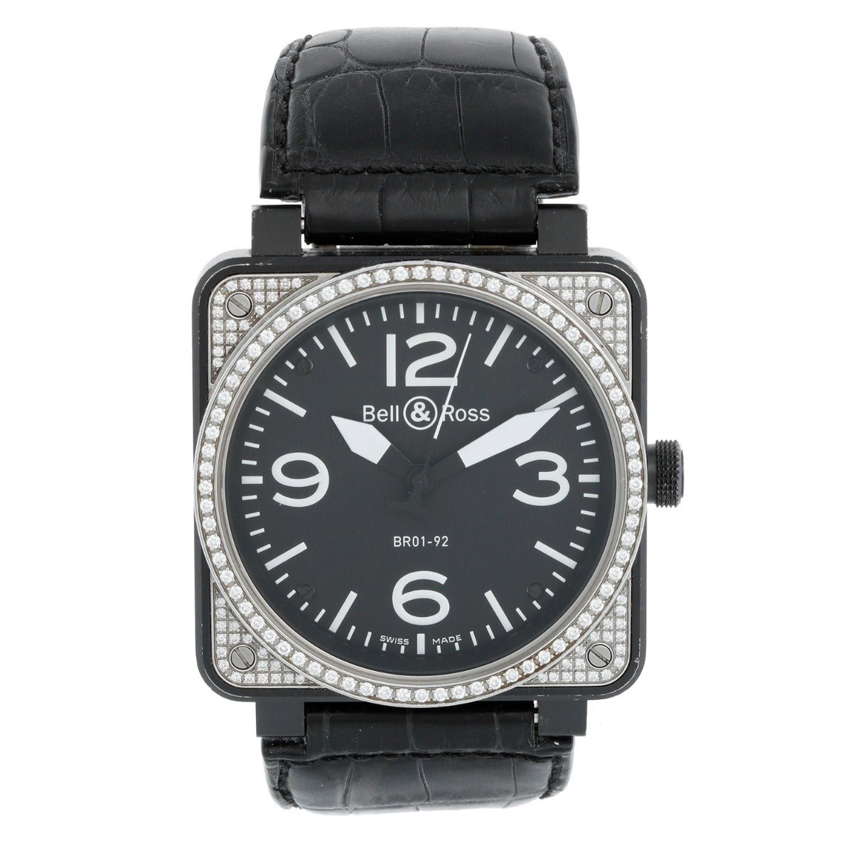 Bell & Ross Stainless Steel Diamond Automatic Mens Watch BR01-92 - Automatic. Stainless steel with Carbon coating; cushion shaped case with diamond bezel ( 46 mm ). Black dial with Arabic and stick numerals. Black leather Bell & Ross Strap with tang buckle. Pre-owned with custom box.