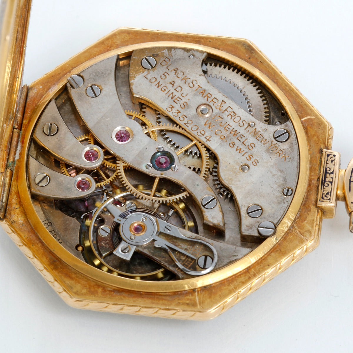 Black Starr & Frost Art Deco Enamel Pocket Watch - Manual winding ; Longines movement , 17 Jewels. 18K Yellow gold hectogon shaped with blue enamel engraving. Blue enamel caseback with initials ( 44 mm ). Gold dial with blue enamel Arabic numerals, guilloche center . Pre-owned with custom box. Rare and unusual. Longines movement.