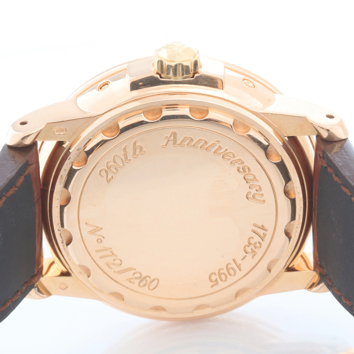 Blancpain Leman 260th Anniversary edition of 260 Pieces Men's 18K Rose Gold Watch 2653-3318-53A - Automatic winding with day, date, month and moonphase. 18k Rose Gold (38mm diameter). Silvered guilloche dial with stick markers and Roman numerals. Brown alligator Blancpain Strap with 18K Rose gold deployant buckle. Pre-owned with Blancpain box and book.