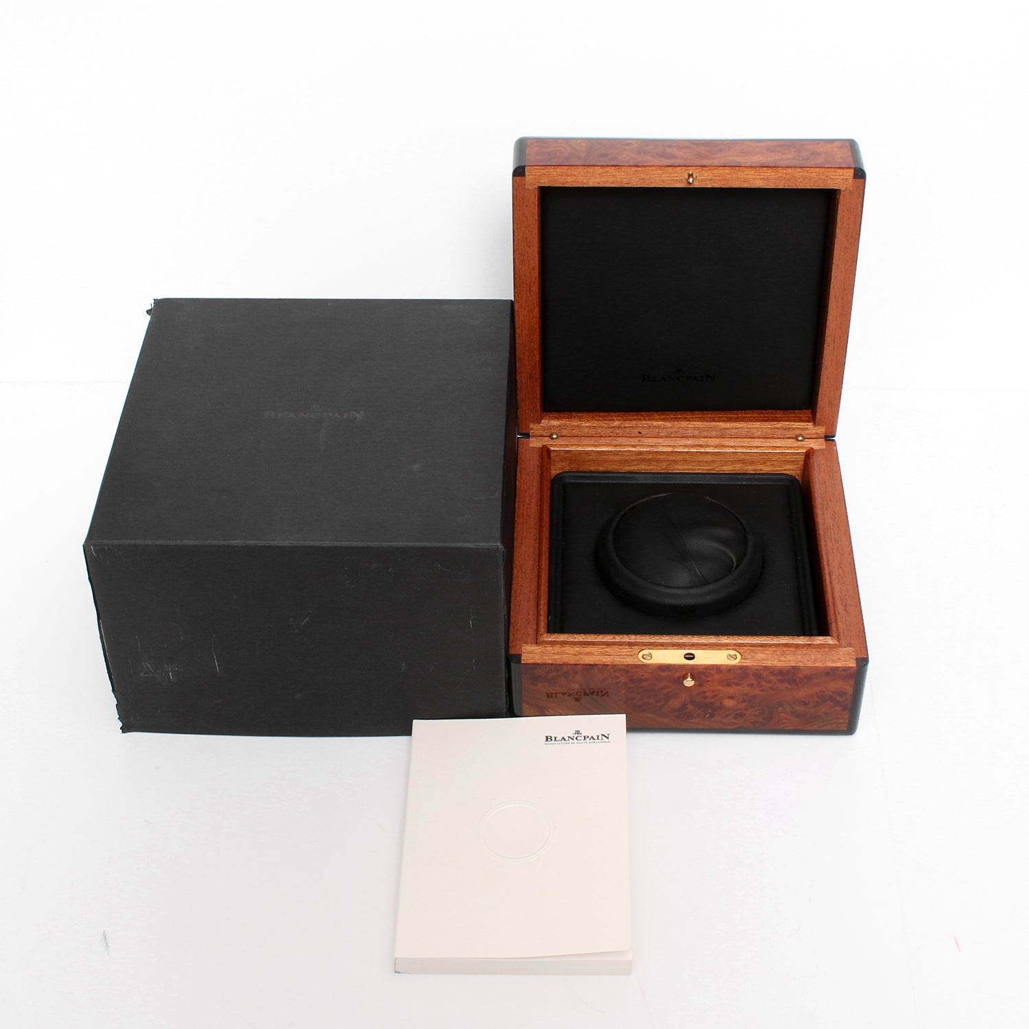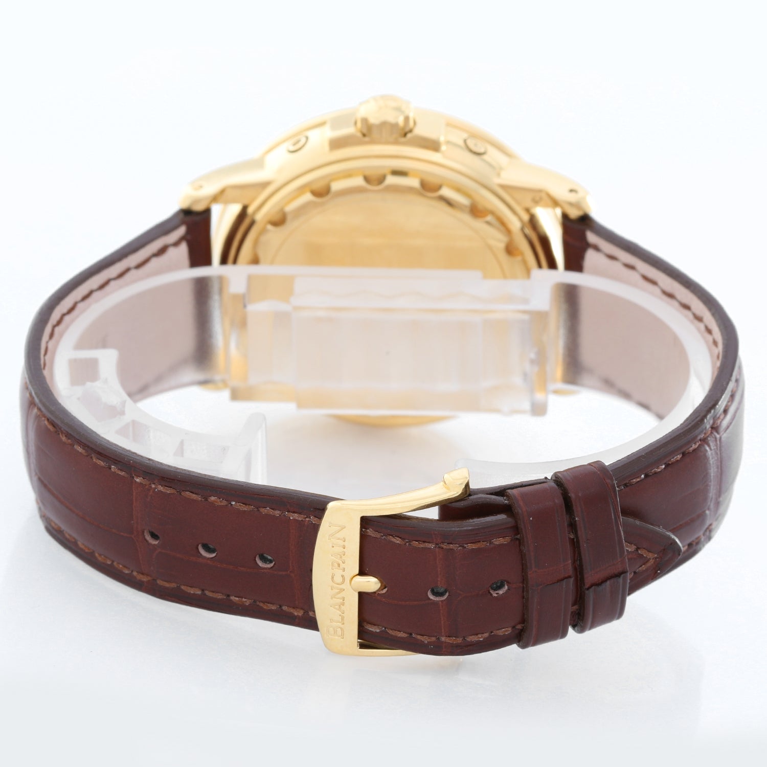 Blancpain Leman Calendar Moonphase Men's 18KYellow Gold Watch 2763-1418A-53 - Automatic winding with day, date, month and moonphase. 18k Yellow Gold (38mm diameter). White dial with stick markers and Roman numerals. Brown alligator Blancpain Strap with 18K yellow gold Blancpain buckle. Pre-owned with Blancpain box and papers.