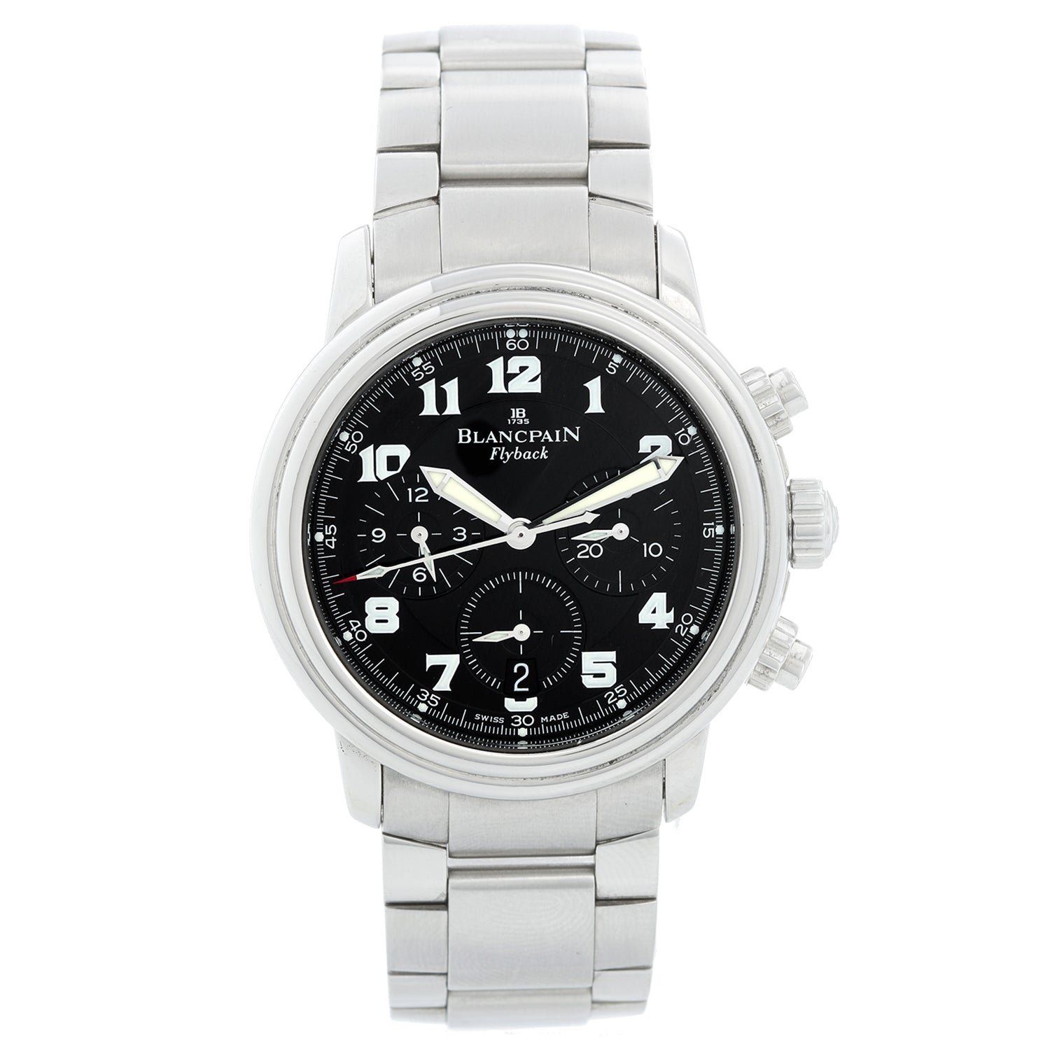 Blancpain Leman Flyback Chronograph Men's Stainless Steel Watch 218F-1139 - Automatic winding. Stainless steel case (38mm diameter). Black dial with white Arabic numerals; hour, minute and seconds recorders. Stainless steel bracelet. Pre-owned with Blancpain box .