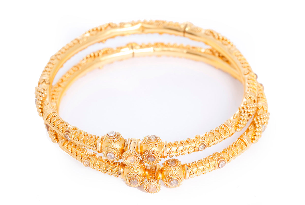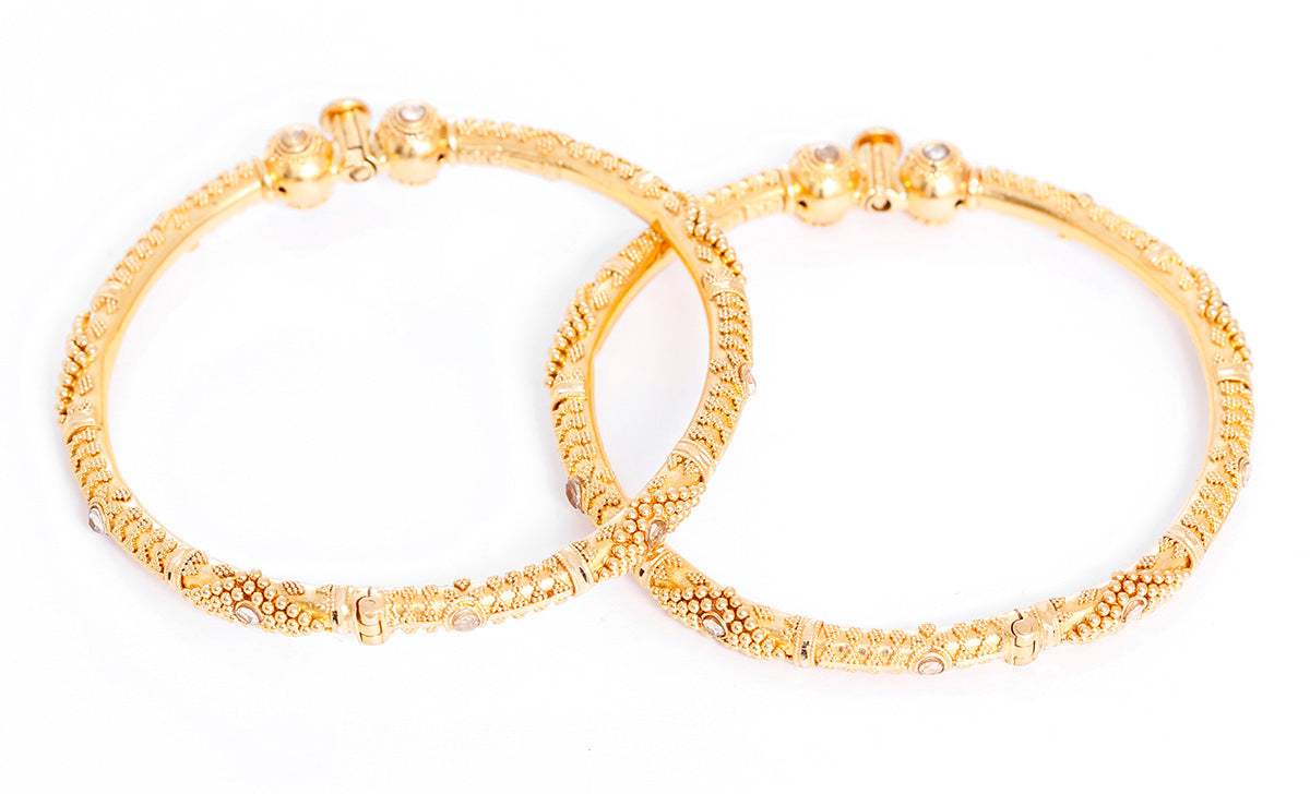This bohemian bangle set features gemstones and an ornate design with matte and shine finish in 22k yellow gold. Bracelet fits up to 7-inch wrist with a screw hinge. Total weight is 33.4 grams. Bracelets can be stacked with other pieces for a unique look or worn alone.