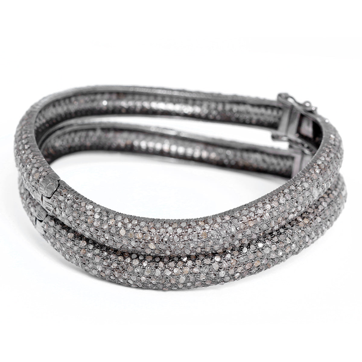 This bohemian style bangle set features a curve design with 13.0 ctw. black diamonds set in sterling silver. This set is perfect for everyday wear and can go from day to night! Can fit up to a 7-inch wrist. Total weight is 40.0 grams.