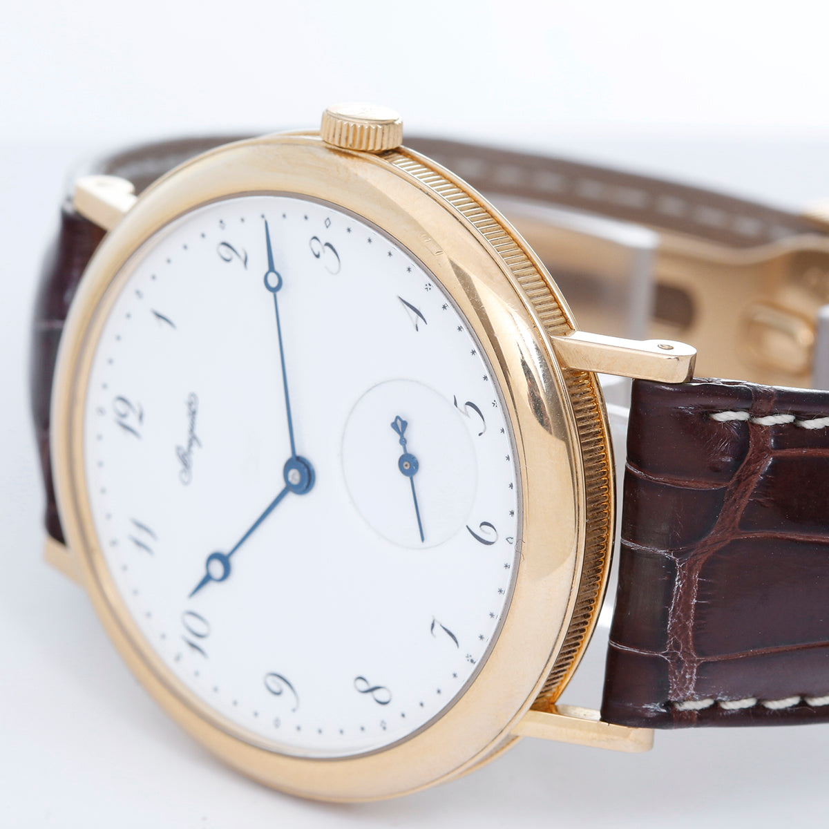 Breguet " Classique" 18K Yellow Gold Men's Watch 5140BA - Automatic winding. 18K Yellow Gold round style case ( 40mm). White enamel dial with black Arabic numerals with Off-Set seconds. Dark brown alligator strap with 18K Yellow Gold deployant clasp. Pre-owned with Breguet box and papers.