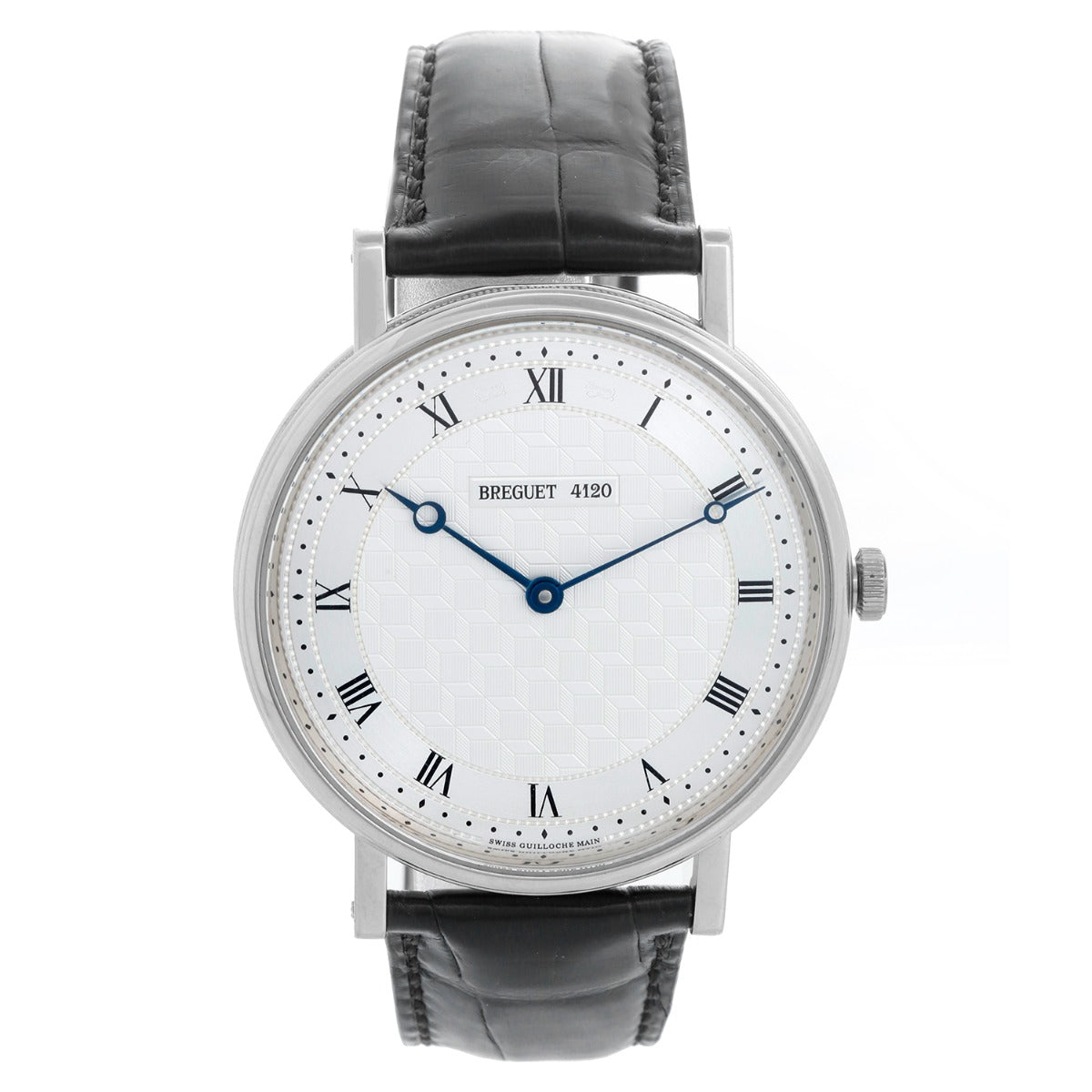 Breguet Classique Extra Thin White Gold Men's Watch Ref 5967 - Manual winding. 18 white gold case with smooth bezel (41mm ). Silver Guilloche Roman numeral dial. New Black Breguet Leather strap with 18K white gold buckle . Pre-owned with custom box.