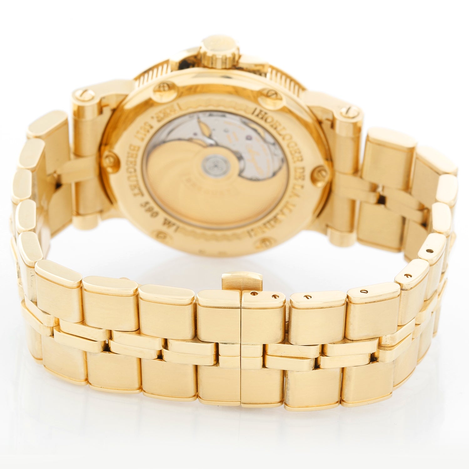 Breguet Marine Automatic Big Date Men's 18k Yellow Gold Watch 5817 - Automatic winding. 18 yellow gold case with exposition back (39mm diameter). 2-tone silver dial with guilloche center and outer ring. Blue Roman numerals; big date at 6 o'clock position. 18K yellow gold Breguet bracelet deployant clasp; will fit up to a 8 inch wrist. Pre-owned with Breguet box and papers.