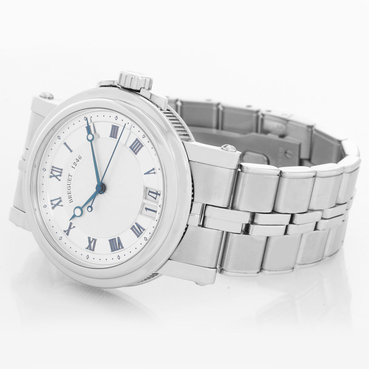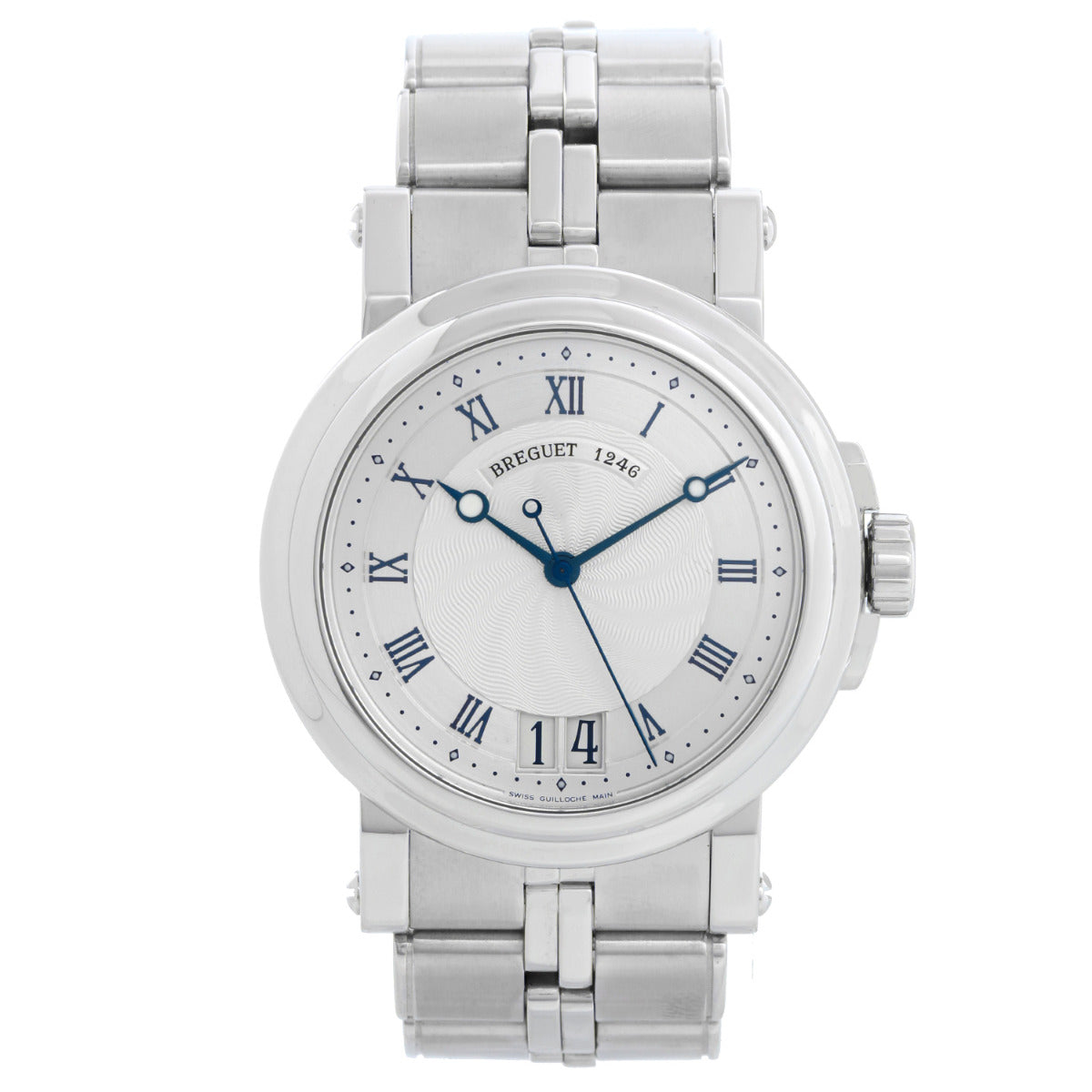 Breguet Marine Automatic Big Date Men's Stainless Steel Watch 5817ST/12/SM0 - Automatic winding. Stainless steel case with exposition back (40mm diameter). Silver dial with Roman numerals and guilloche center; big date at 6 o'clock. Stainless steel Breguet link bracelet. Pre-owned with Breguet box and papers.
