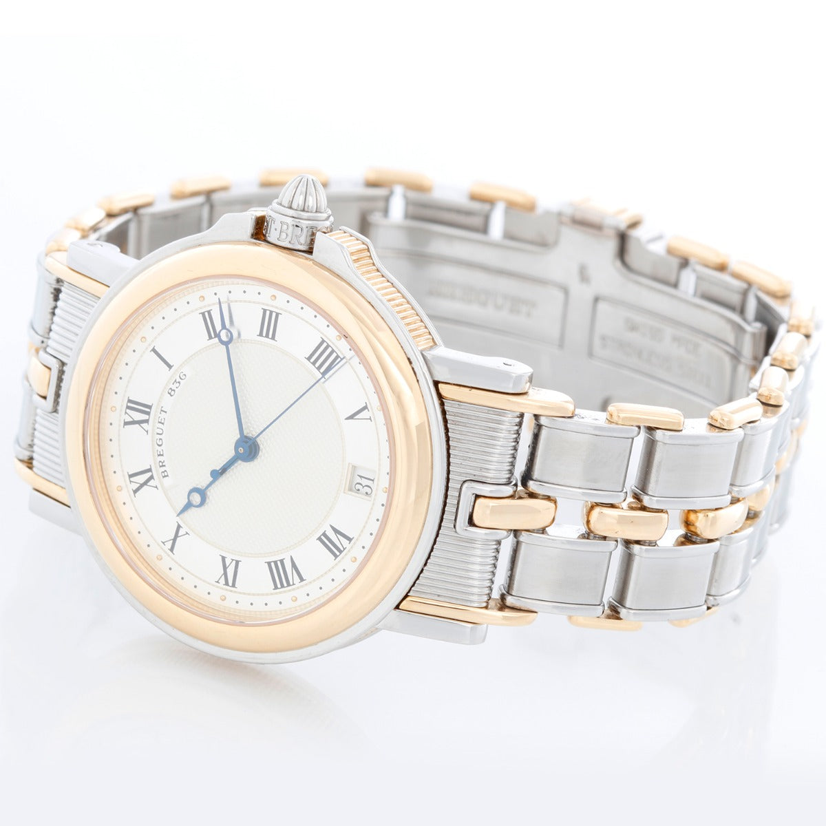 Breguet Marine Men's Steel & Gold 2-Tone Automatic Watch 3400SA/12/X90 - Automatic winding. Stainless steel case with 18k yellow gold coin edge and smooth bezel (35mm diameter). 2-Tone silver guilloche dial with black Roman numerals; date at 6 o'clock position. Stainless steel and 18k yellow gold bracelet with deployant clasp; will fit a 7 1/4 inch wrist . Pre-owned with custom box.