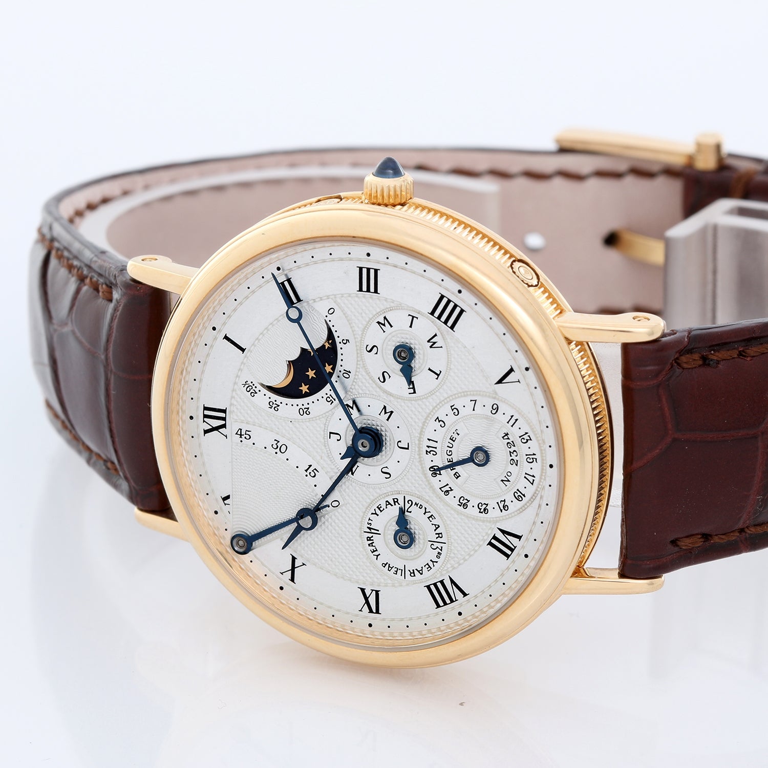 Breguet Perpetual Calendar Power Reserve Men's 18k Yellow Gold Watch Ref. 3310ba/13/296 ( 3310 ) - Automatic winding. 18k yellow gold case (39mm diameter). 2-Tone silver dial with black Roman numerals; day, date, month, moonphase; leap year and power reserve indicators. Strap band with 18k yellow gold with buckle. Pre-owned with box and papers.