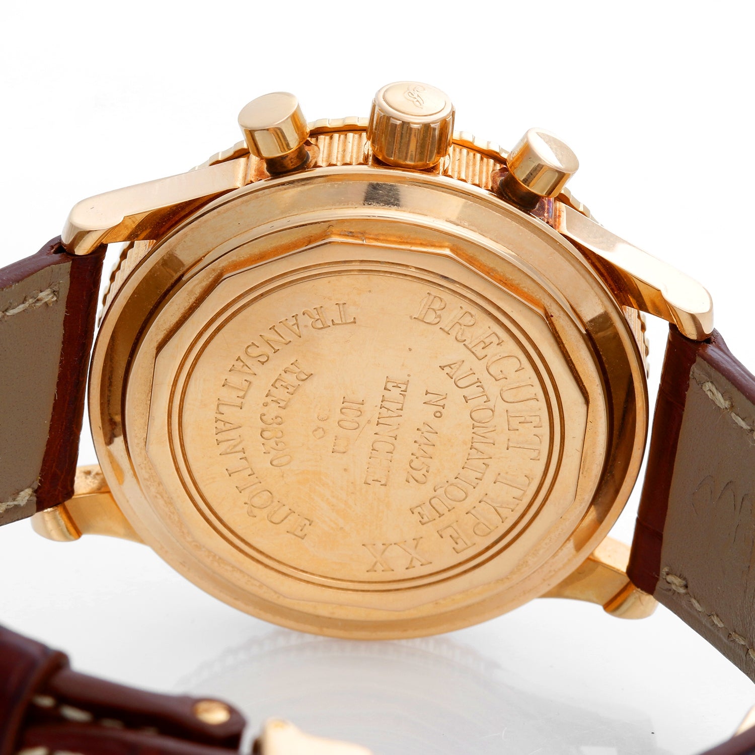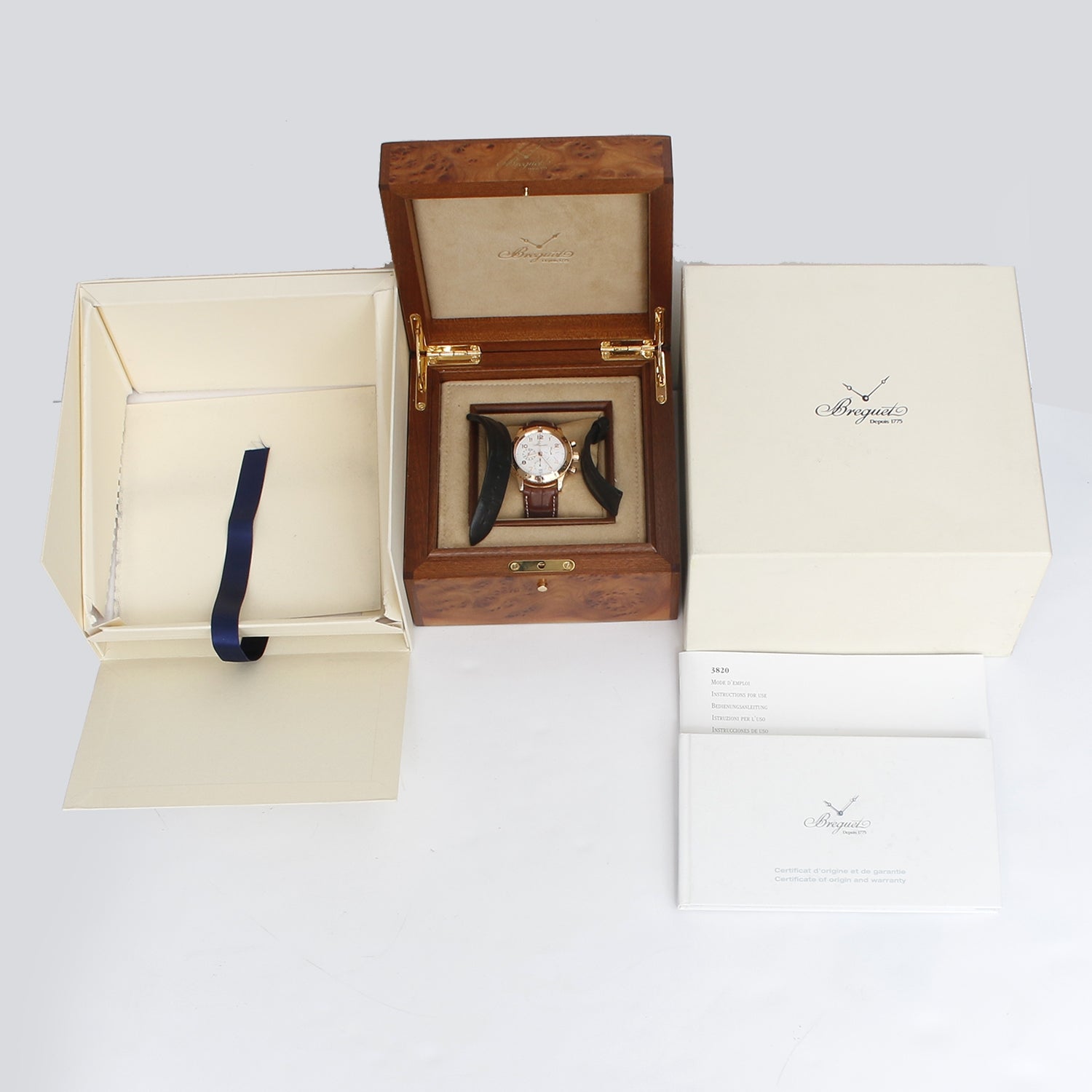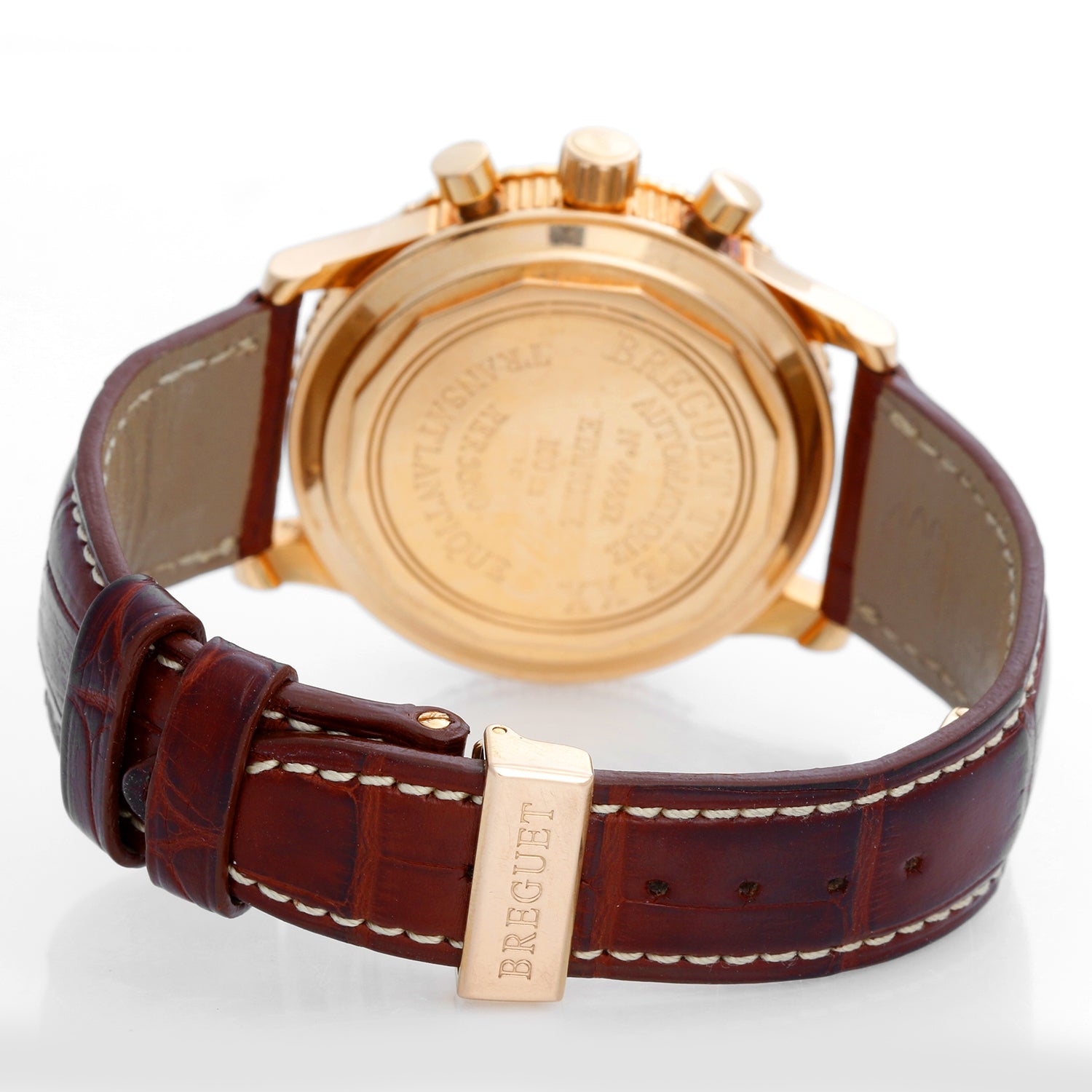 Breguet Type XX Transatlantique Chronograph Men's Watch Ref. 3820 - Automatic winding; chronograph. 18K Rose gold with bi-directional rotating bezel (39mm diameter). White dial with Arabic numerals; date at 6 o'clock position; hour, minute and seconds recorders. Brown alligator strap with 18K Rose gold deployant buckle. Pre-owned with Breguet box and papers.